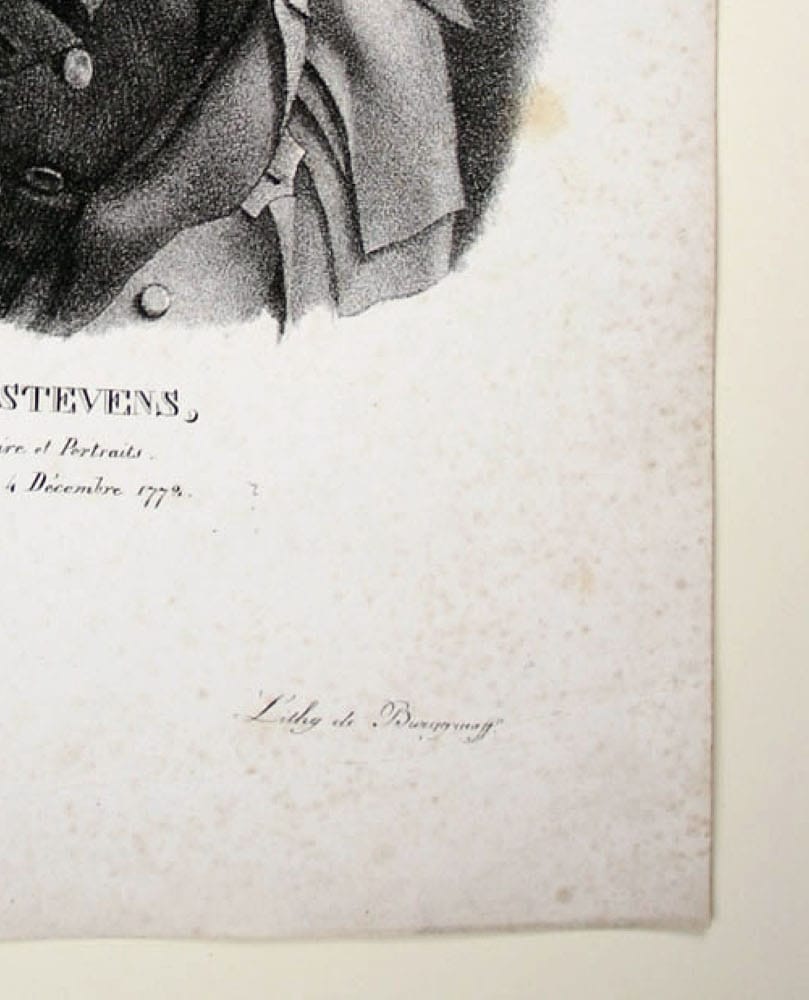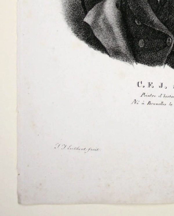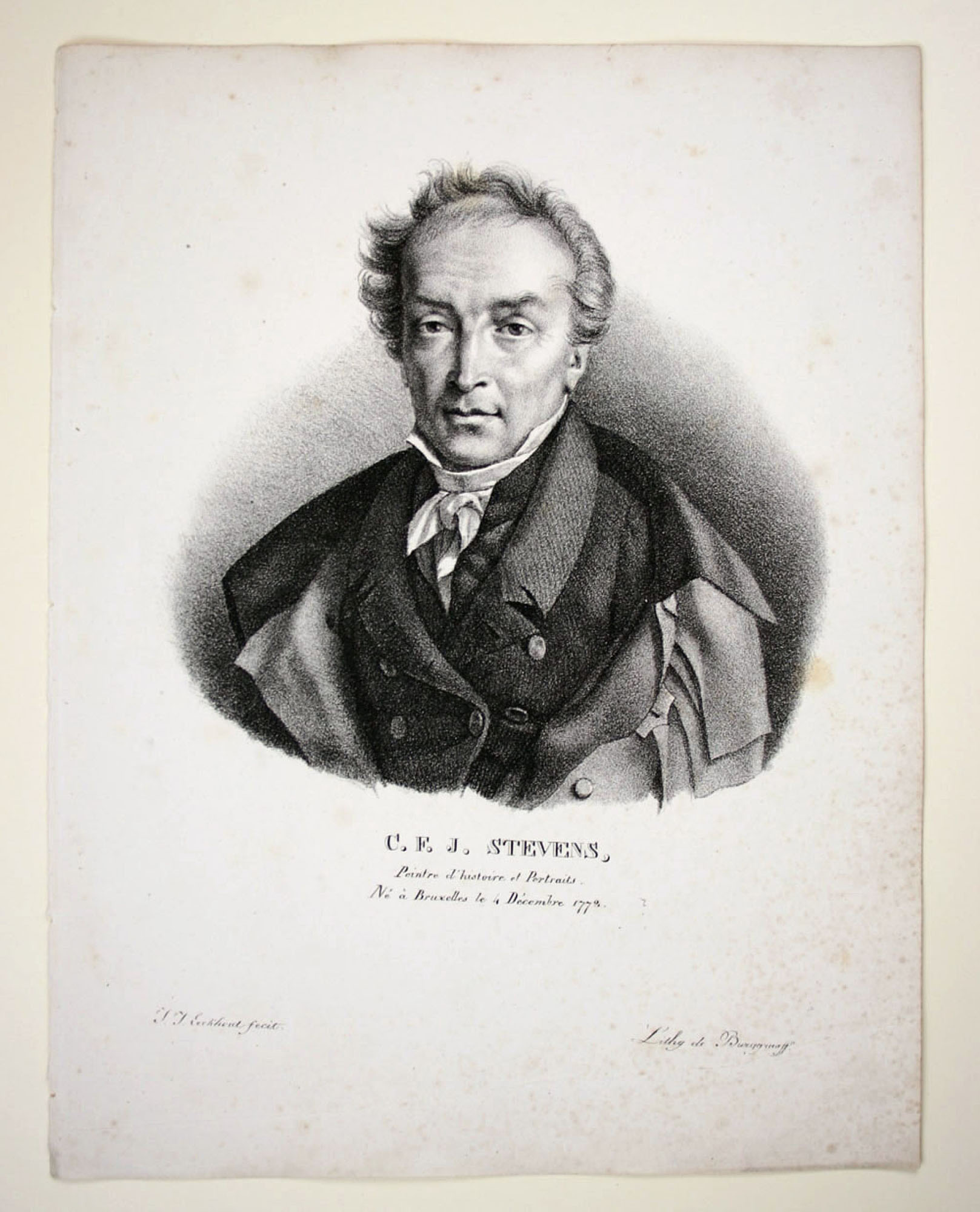 - Description: Lithograph of Burggraaff, inscribed at the bottom: ” C. F. J. Stevens, Peintre d`histoire et Pertraits. Né à Bruxelles le 4 Decembre 1772. J. J. Eeckhout Lithog. de Burggraaff”. Portrait of C. F. J. Stevens en face. Burggraaff was a Belgian lithographer active from about 1801 to 1850 at the Royal Academy in Brussels. He became known mainly for his portraits of contemporary artists.