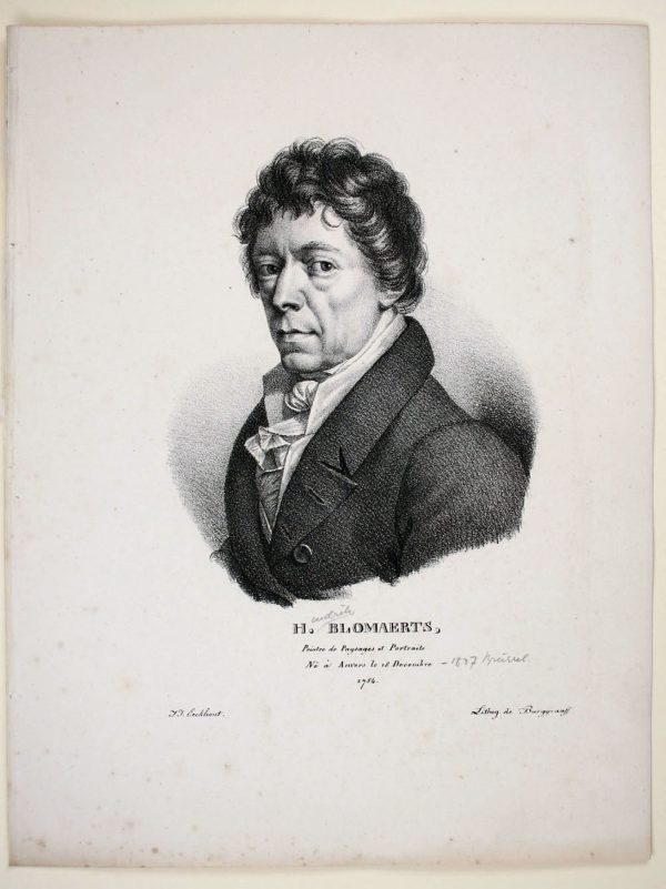 - Description: Lithograph by Burggraaff, inscribed at the bottom: “H. Blomaerts, Peintre de Paysage et Portraits. Neé à Anvers le 18 Decembre 1754. J. J. Eeckhout Lithog. de Burggraaff”. Portrait of Hendrik Blomaerts in black jacket to half left . Burggraaff was a Belgian lithographer active from about 1801 to 1850 at the Royal Academy in Brussels. He was best known for his portraits of contemporary artists. Hendrik Blomaerts (Antwerp 1755 – Brussels 1837) was a Belgian portrait and landscape painter.