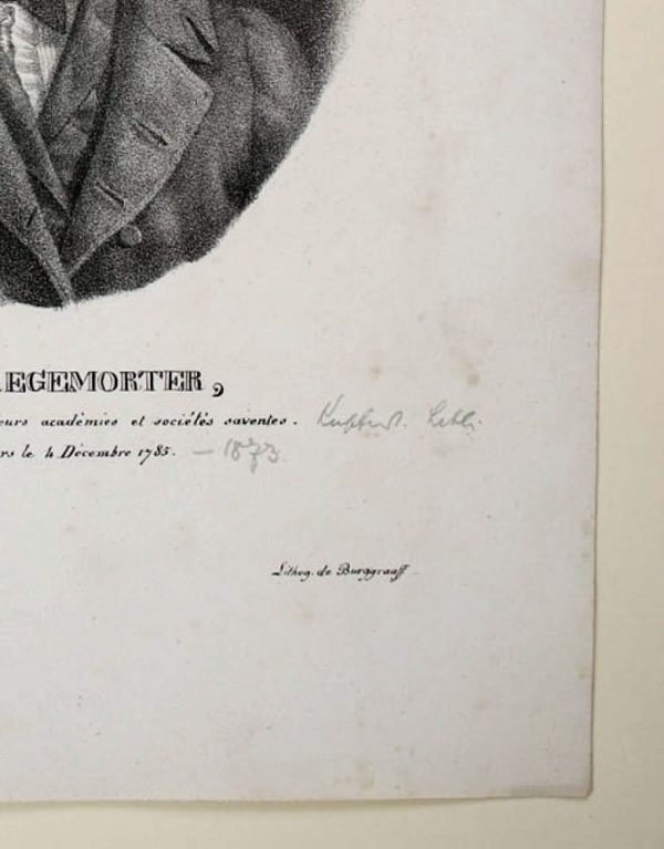- Beschreibung: Burggraaff, Porträt des Ignatius Jozef Pieter van Regemorter, Lithographie nach Jakob Josef Eeckhout, um 1830. Beschreibung:Lithographie von Burggraaff, bezeichnet unten: “U. L. Vanregemorter, Peintre de paysage, membre de plusieurs academies et societes savantes. Né à Anvers le 4 Decembre 1785. J. J. Eeckhout Lithog. de Burggraaff”. Porträt des Ignatius Jozef Pieter van Regemorter nach links. Burggraaff war ein von etwa 1801 bis 1850 tätiger belgischer Lithograph an der königlichen Akademie in Brüssel. Bekannt wurde er vor allem durch seine Porträts zeitgenössischer Künstler. Ignatius Jozef Pieter van Regemorter (Antwerpen 1785 – Antwerpen 1873) war Genremaler, Marinemaler, Landschaftsmaler, Kupferstecher und Lithograph. Er hatte bei seinem Vater, Petrus Johannes R. gelernt. Er war u. a. in Amsterdam, Antwerpen, Paris, Gent und Brüssel tätig.