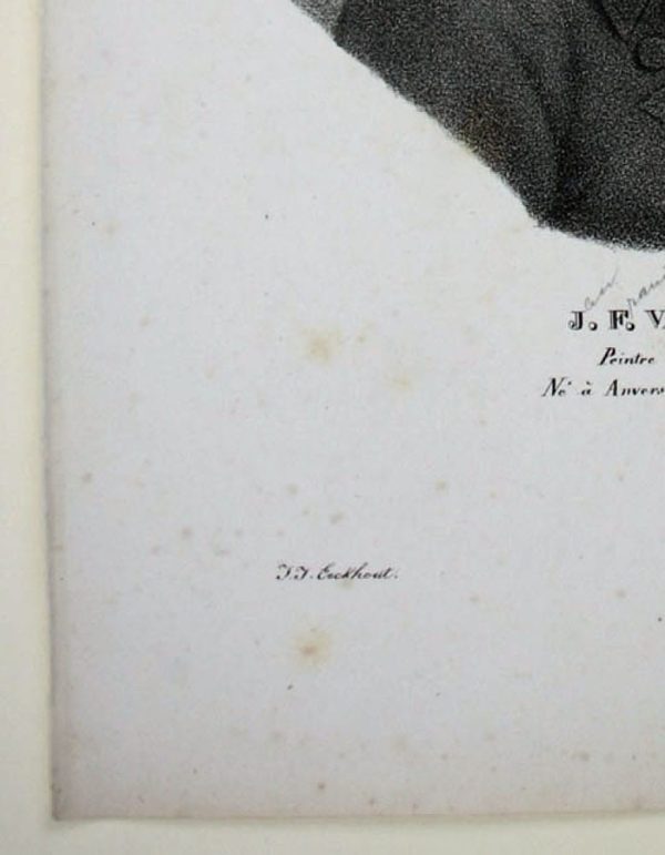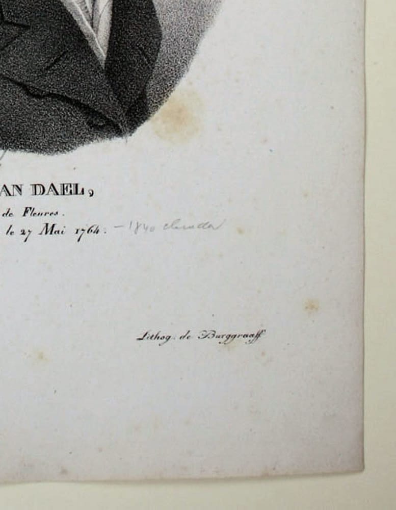 - Beschreibung: Burggraaff, Porträt des Jan Frans van Dael, Lithographie nach Jakob Josef Eeckhout, um 1830. Beschreibung:Lithographie von Burggraaff, bezeichnet unten: “J. F. van Dael, Peintre de Fleures. Ne´ à Anvers le 27 Mai 1764. J. J. Eeckhout Lithog. de Burggraaff”. Porträt des Jan Frans van Dael in jungen Jahren nach rechts. Burggraaff war ein von etwa 1801 bis 1850 tätiger belgischer Lithograph an der königlichen Akademie in Brüssel. Bekannt wurde er vor allem durch seine Porträts zeitgenössischer Künstler. Jan Frans van Dael (Antwerpen 1764 – Paris 1840) war belgischer Blumen-, Landschafts- und Miniaturmaler.
