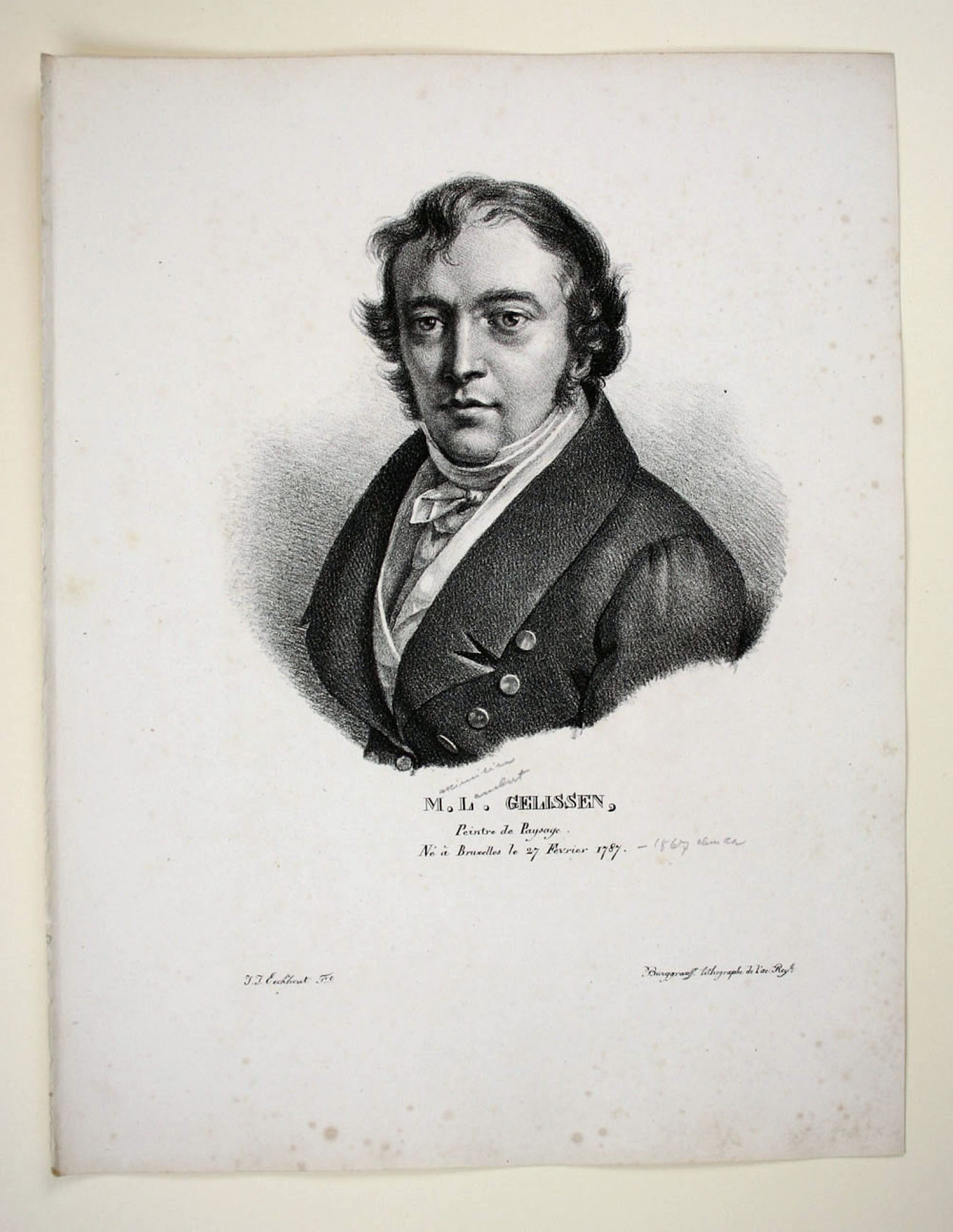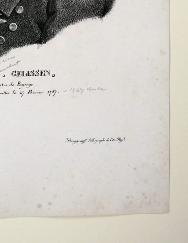 - Description: Burggraaff, Portrait of Maximilian Lambert Gelissen, lithograph after Jakob Josef Eeckhout, c. 1830. Description:Lithograph by Burggraaff, inscribed at the bottom: “M. L. Gelissen, Peintre de Paysage. N Bruxelles le 27 Fevrier 1787. J. J. Eeckhout Burggraaff lithographe de l`ace: Roy. “. Portrait of the young Maximilian Lambert Gelissen. Burggraaff was a Belgian lithographer working at the Royal Academy in Brussels from about 1801 to 1850. He became known mainly for his portraits of contemporary artists. Maximilian Lambert Gelissen (Brussels 1786 – ibid. 1867) was a Belgian landscape painter and lithographer.