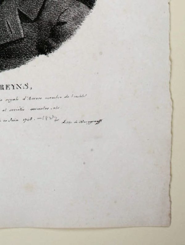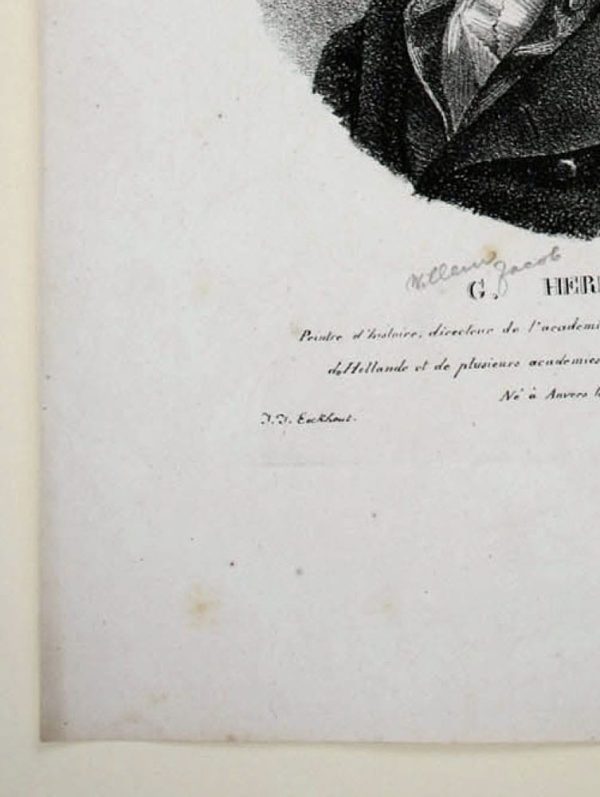- Beschreibung: Burggraaff, Porträt des Willem Jacob Guillaume-Jacques Herreyns, Lithographie nach Jakob Josef Eeckhout, um 1830. Beschreibung:Lithographie von Burggraaff, bezeichnet unten: “G. Herreyns. Peintre d`histoire, directeur de l`acadmie royale d`Anvers membre de l`institut de Hollande et de Plusieurs academies et societes savantes etc. Né à Anvers le 10 Juin 1743. J. J. Eeckhout Litho. de Burggraaff”. Burggraaff war ein von etwa 1801 bis 1850 tätiger belgischer Lithograph an der königlichen Akademie in Brüssel. Bekannt wurde er vor allem durch seine Porträts zeitgenössischer Künstler. Willem Jacob Herreyns (Antwerpen 1743 – Antwerpen 1827)war Maler und Zeichner.