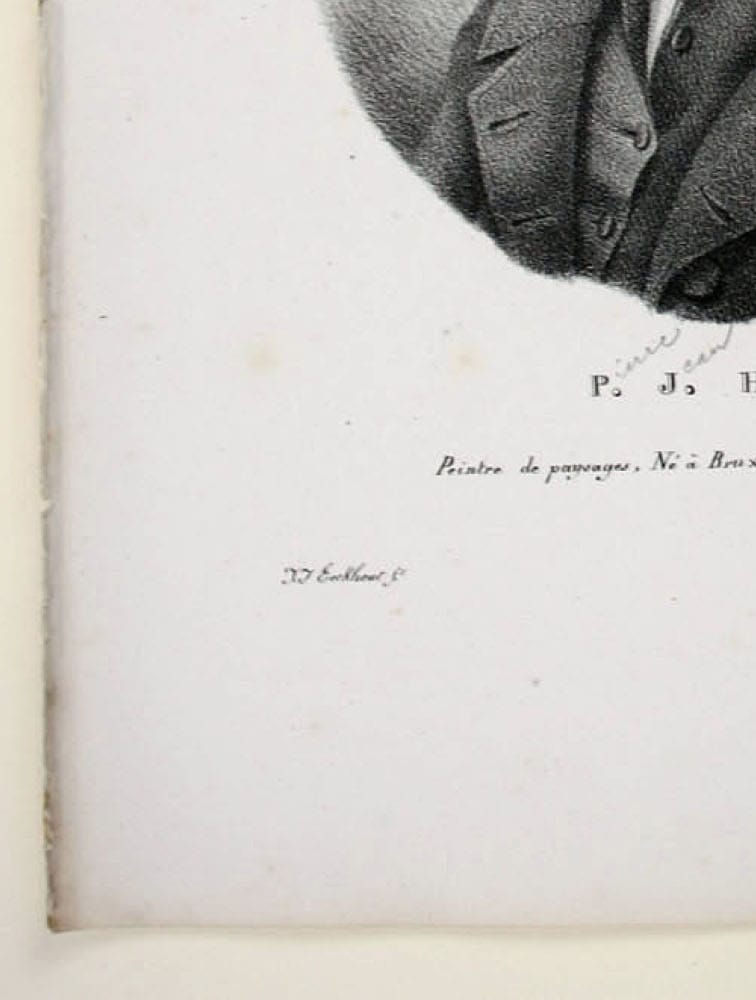 • Description: Lithograph by Burggraaff, inscribed at the bottom: “P. J. Hellemans, Peintre de paysage, N Bruxelles le 21 Novembre 1787. J. J. Eeckhout Lithog. de Burggraaff”. Portrait of the young Pierre Jan Hellemans. Burggraaff was a Belgian lithographer working at the Royal Academy in Brussels from about 1801 to 1850. He became famous especially for his portraits of contemporary artists. Pierre Jan Hellemans (Brussels 1787 – Brussels 1845) was a landscape painter.