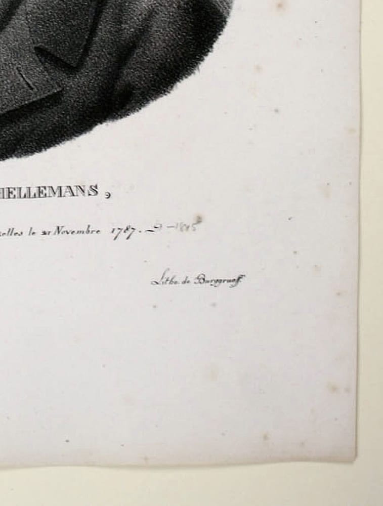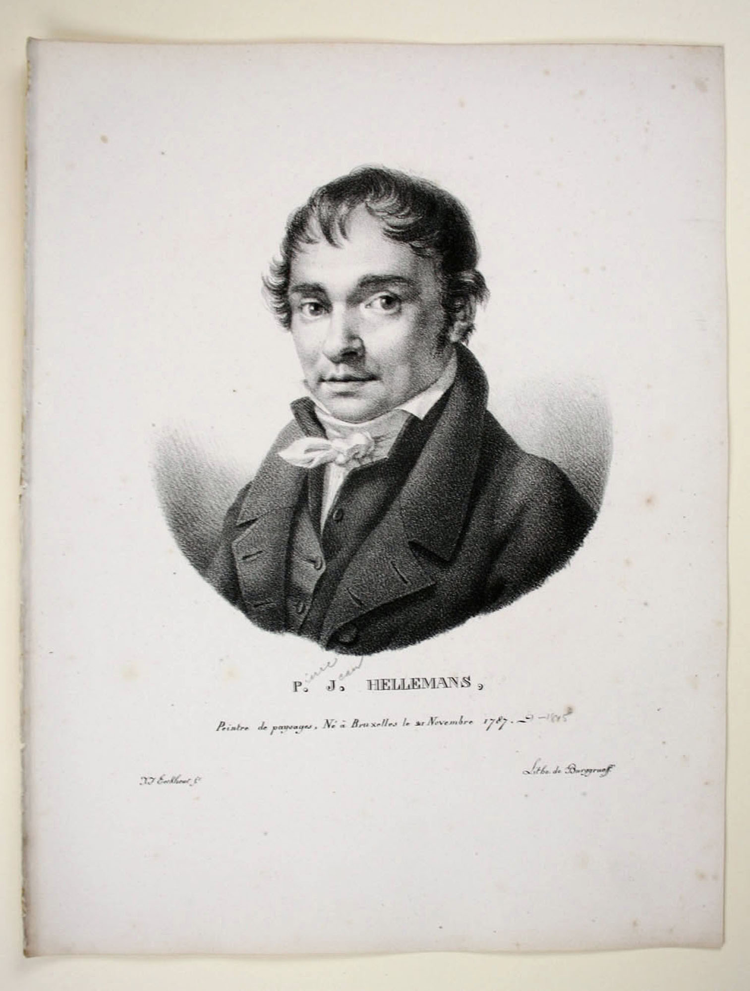 Lithographie von Burggraaff, bezeichnet unten: “P. J. Hellemans, Peintre de paysage, Né à Bruxelles le 21 Novembre 1787. J. J. Eeckhout Lithog. de Burggraaff”. Porträt des jungen Pierre Jan Hellemans. Burggraaff war ein von etwa 1801 bis 1850 tätiger belgischer Lithograph an der königlichen Akademie in Brüssel. Bekannt wurde er vor allem durch seine Porträts zeitgenössischer Künstler. Pierre Jan Hellemans (Brüssel 1787 – Brüssel 1845) war Landschaftsmaler.
