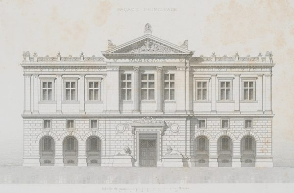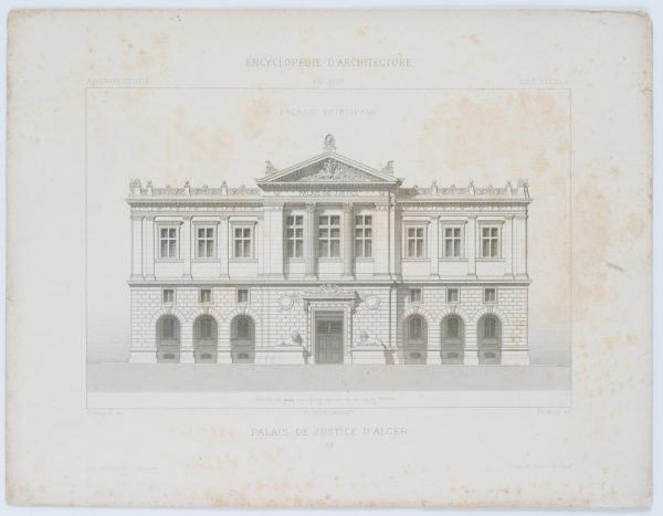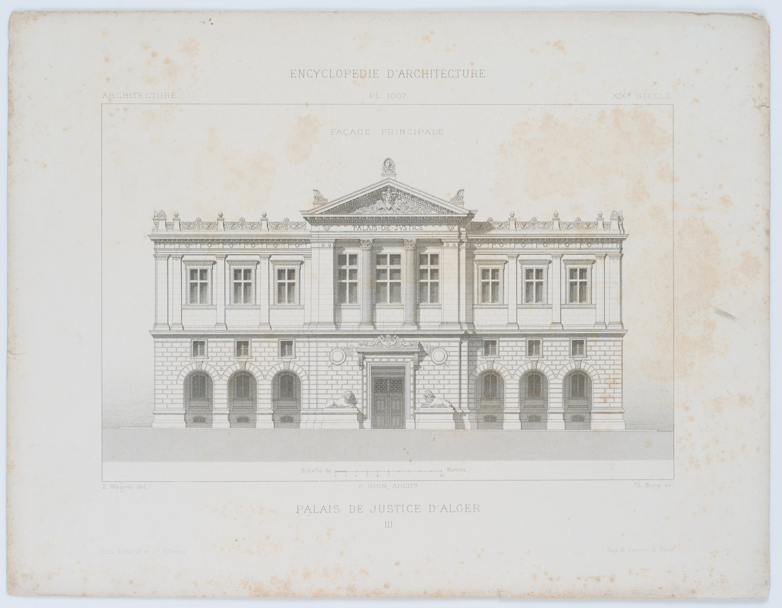 Charles-Jules Bury (19. Jahrhundert) nach Eugène-Émile Wagret (*1858 Valenciennes), „Palais de Justice D’Alger“, Justizpalast, Hauptfassade, Encyclopedie d’architecture, Platte 1007, 19. Jahrhundert, Lithographie