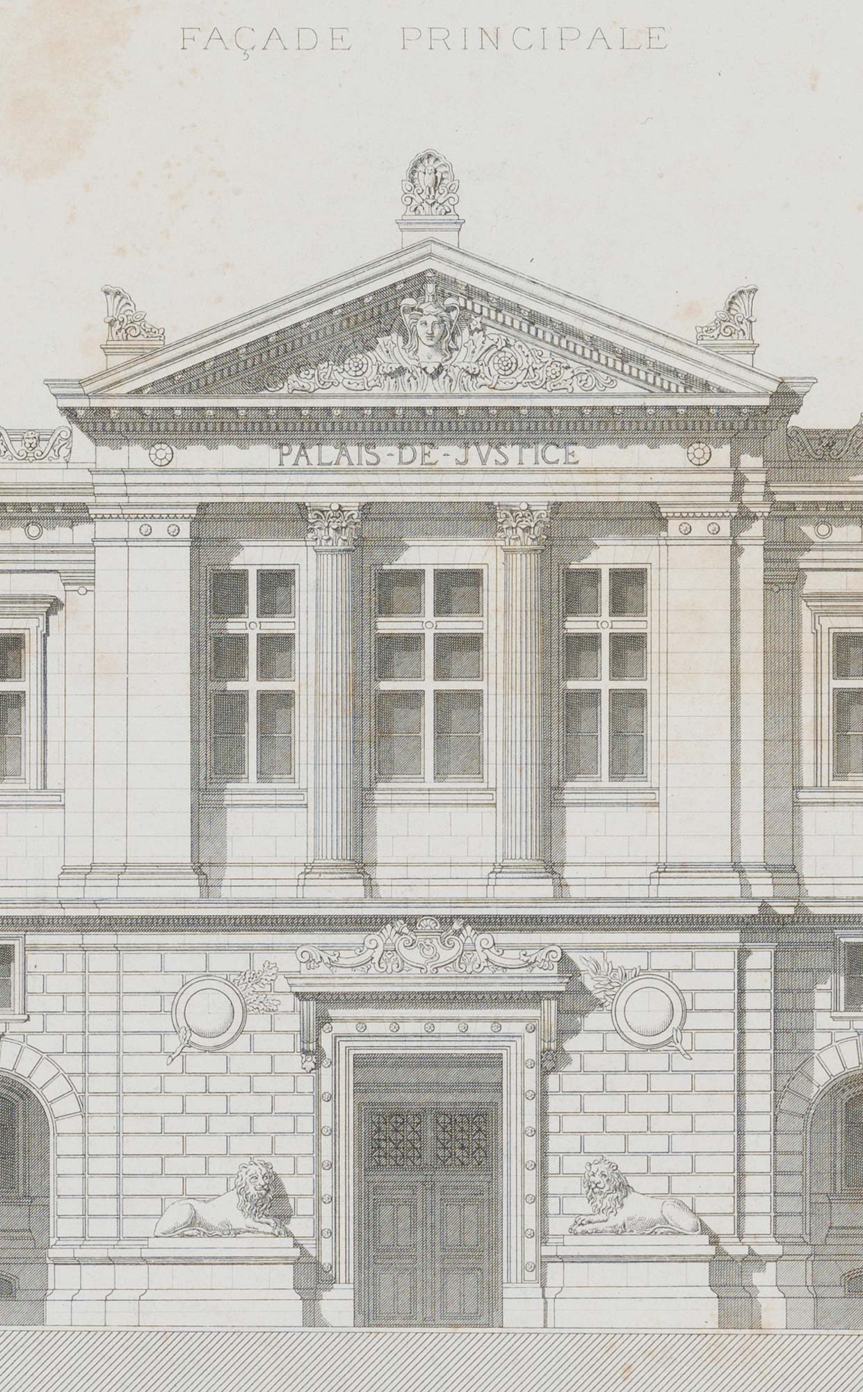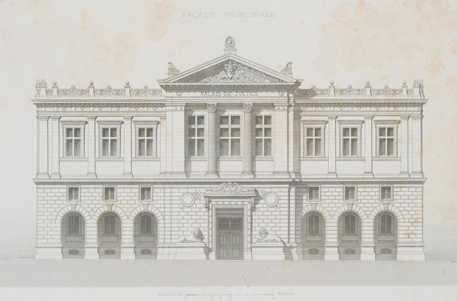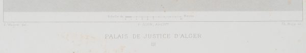 Charles-Jules Bury (19th century) after Eugène-Émile Wagret (born 1858 Valenciennes), „Palais de Justice D’Alger“, Justizpalast, Hauptfassade, Encyclopedia of Architecture, Platte 1007, 19th century, Lithography