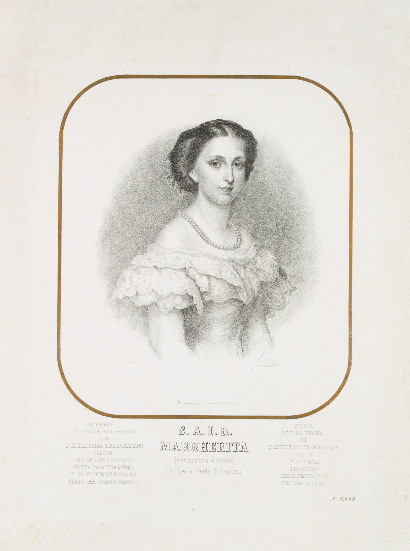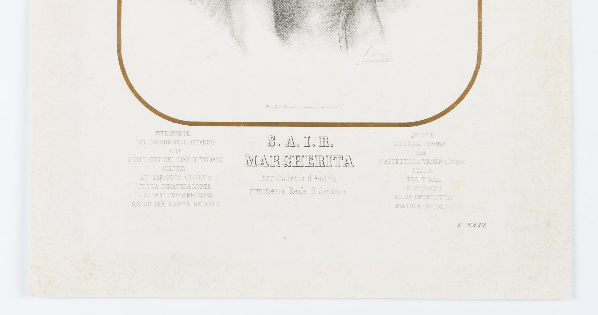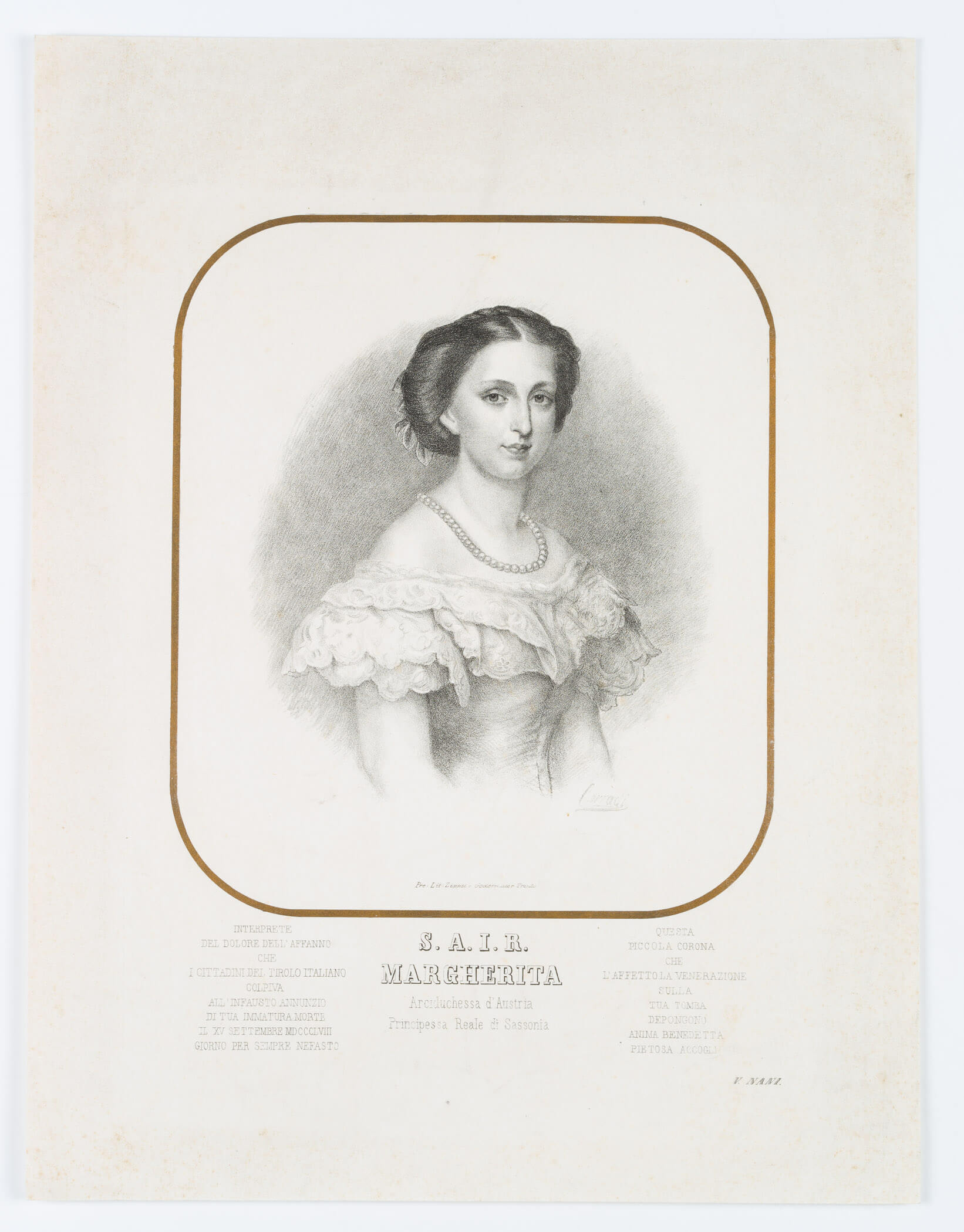 - Inscription: Lower right signed in the printing plate: “Carradi[?] | V. Nani”. Lower middle inscribed in the printing plate: “S.A.I.R. Margherita Arciduchessa d’Austria Principessa Reale di Sassonia”.