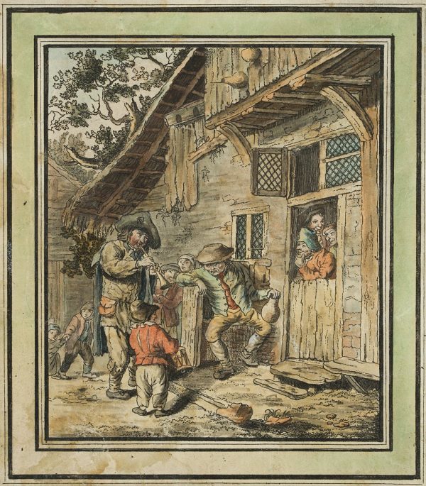 Cornelis Ploos van Amstel (1726 Weesp – 1798 Amsterdam) zugeschrieben, Wandernde Musiker mit Schalmei und Trommel an einem Bauernhaus, 18. Jahrhundert, Radierung