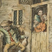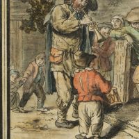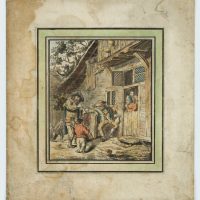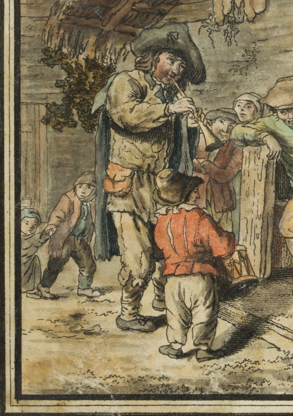 - Beschreibung: In dieser heiteren Genreszene zeigt der Künstler einen reisenden Schalmeienspieler mit einem kleinwüchsigen Trommler. Beide stehen am Weg vor einem Bauernhaus und spielen munter eine Weise, während ihnen die Bewohner des Hauses neugierig lauschen. Ein trunken wirkender Bauer vor der Haustür blickt die lärmenden Gesellen finster an.