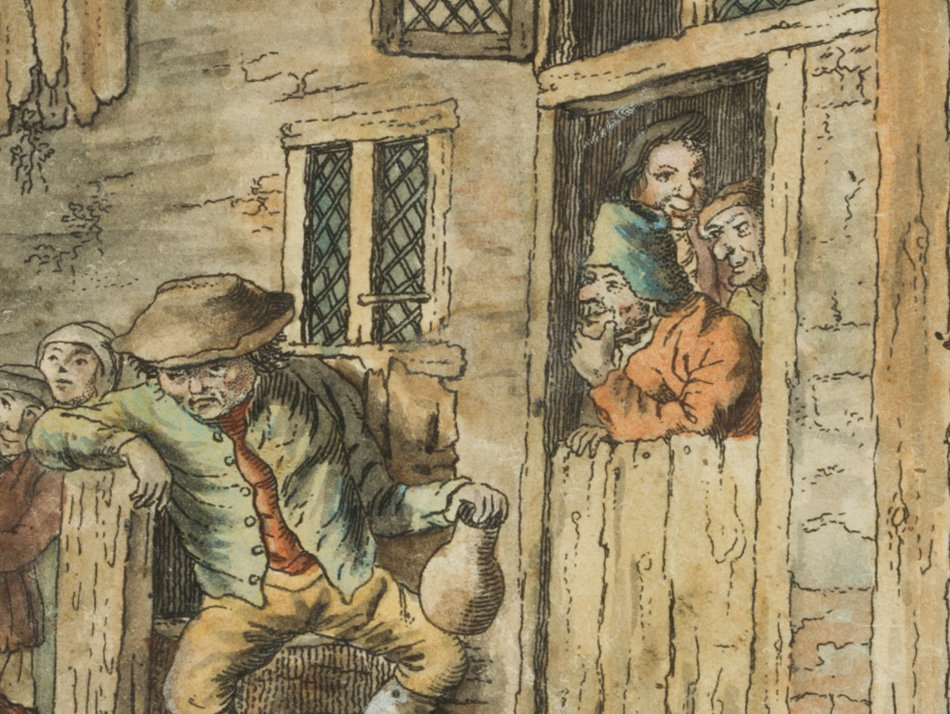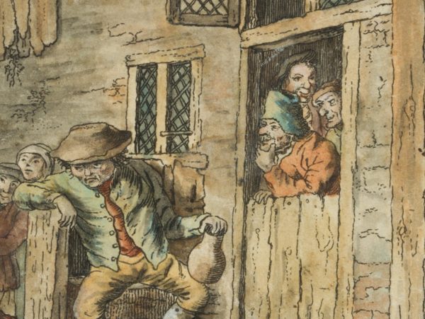 In this cheerful genre scene, the artist shows a travelling shawm player with a pint-sized drummer. Both are standing on the path in front of a farmhouse and are blithely playing a tune while the inhabitants of the house listen to them curiously. A drunken farmer at the front door scowls at the noisy fellows.