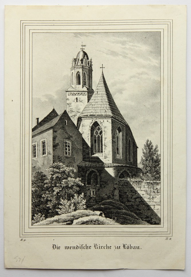 Carl Wilhelm Arldt (1809 Niederruppersdorf – 1868 Löbtau), Die wendische Kirche zu Löbau, Blick auf Chor und Turm, 19. Jahrhundert, Lithographie