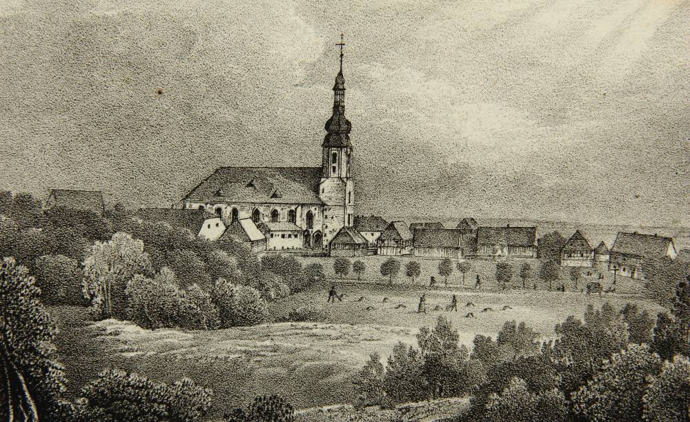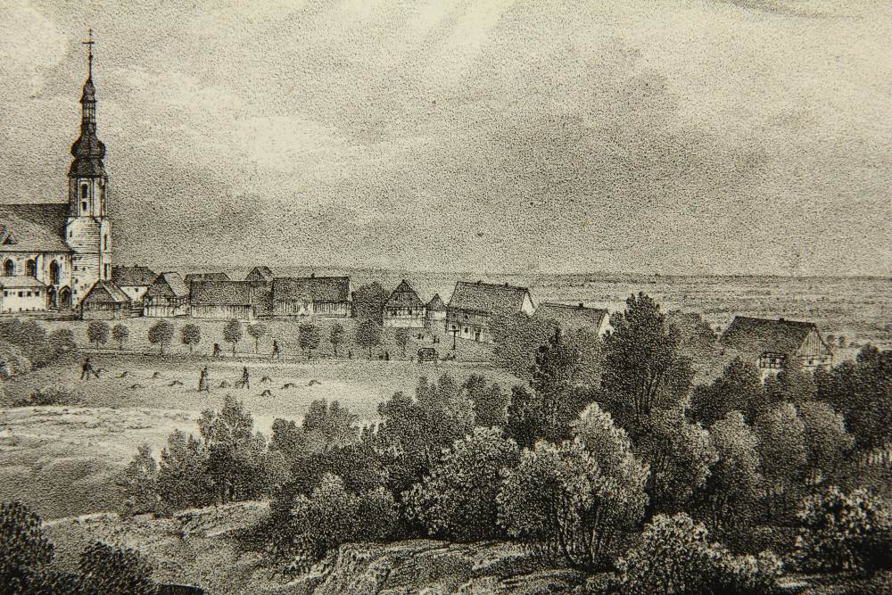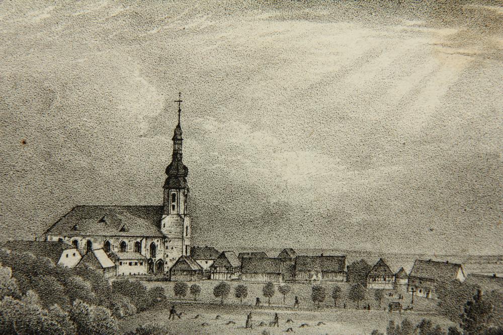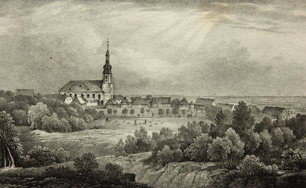 Carl Wilhelm Arldt (1809 Niederruppersdorf – 1868 Löbtau), Hochkirch near Bautzen, view of church, 19th century, Lithography