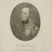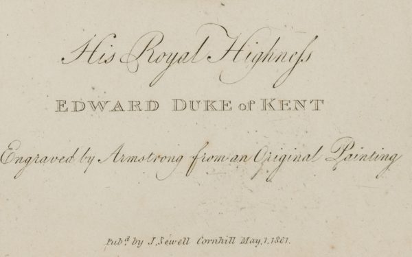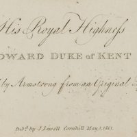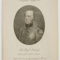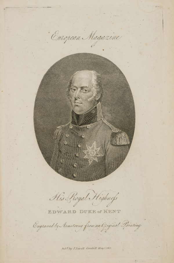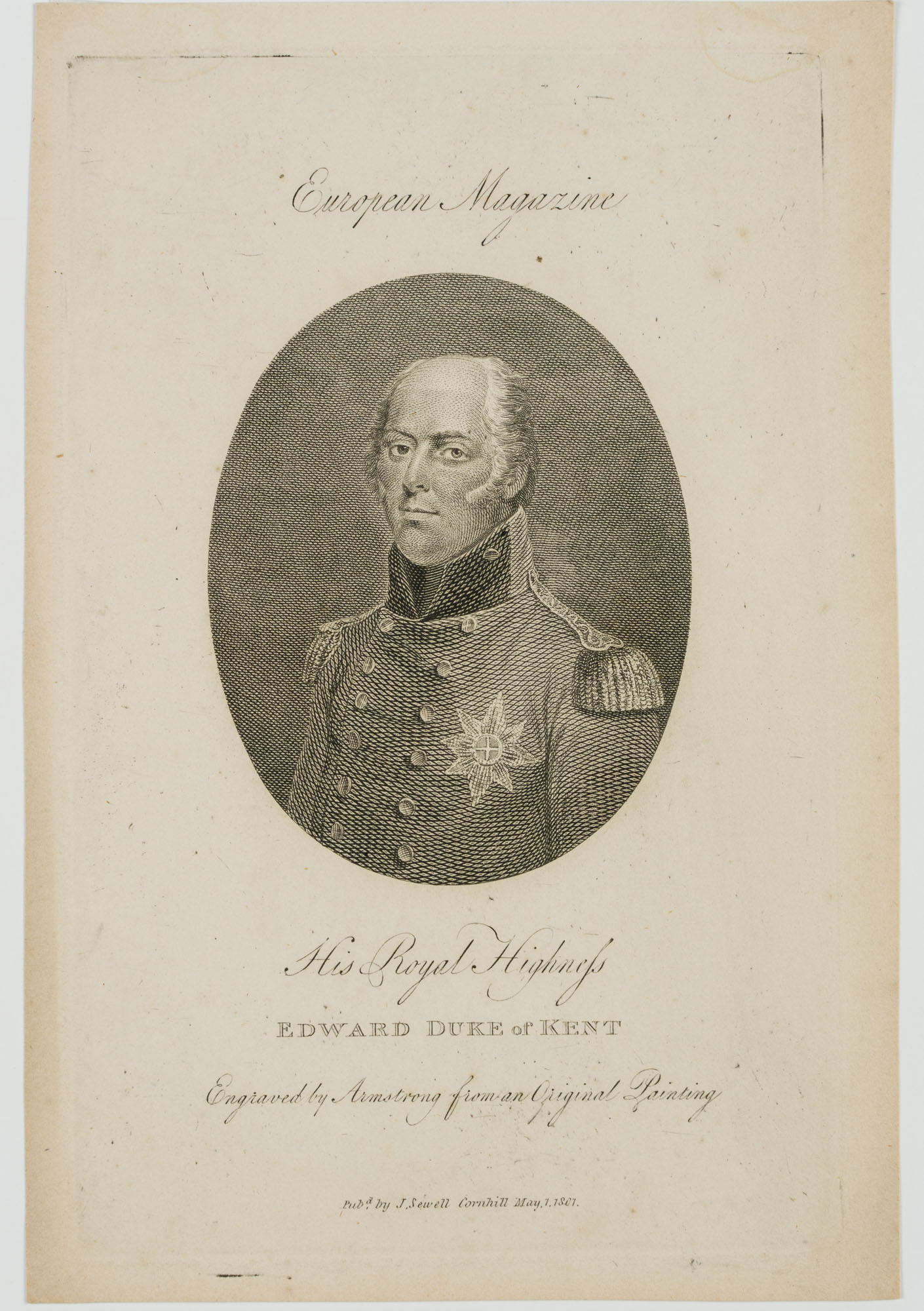 - Description: Inscribed with title and production notes: “Engraved by Armstrong from an Original Painting”; publication line: “Published by J. Sewell Cornhill May 1. 1801”. Illustration for “The European Magazine” (1801). The sitter is Edward Augustus, Duke of Kent and Strathearn (1767 London – 1820 Devon), he was the fourth son of King George III of Great Britain, Ireland and Hanover and of Queen Charlotte. He was the father of Queen Victoria (the great-grandmother of Queen Elizabeth II).