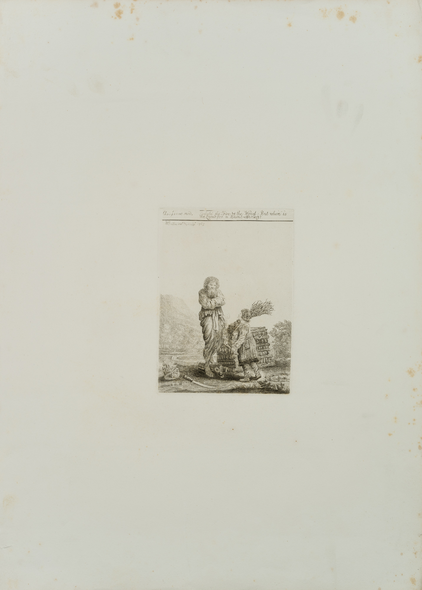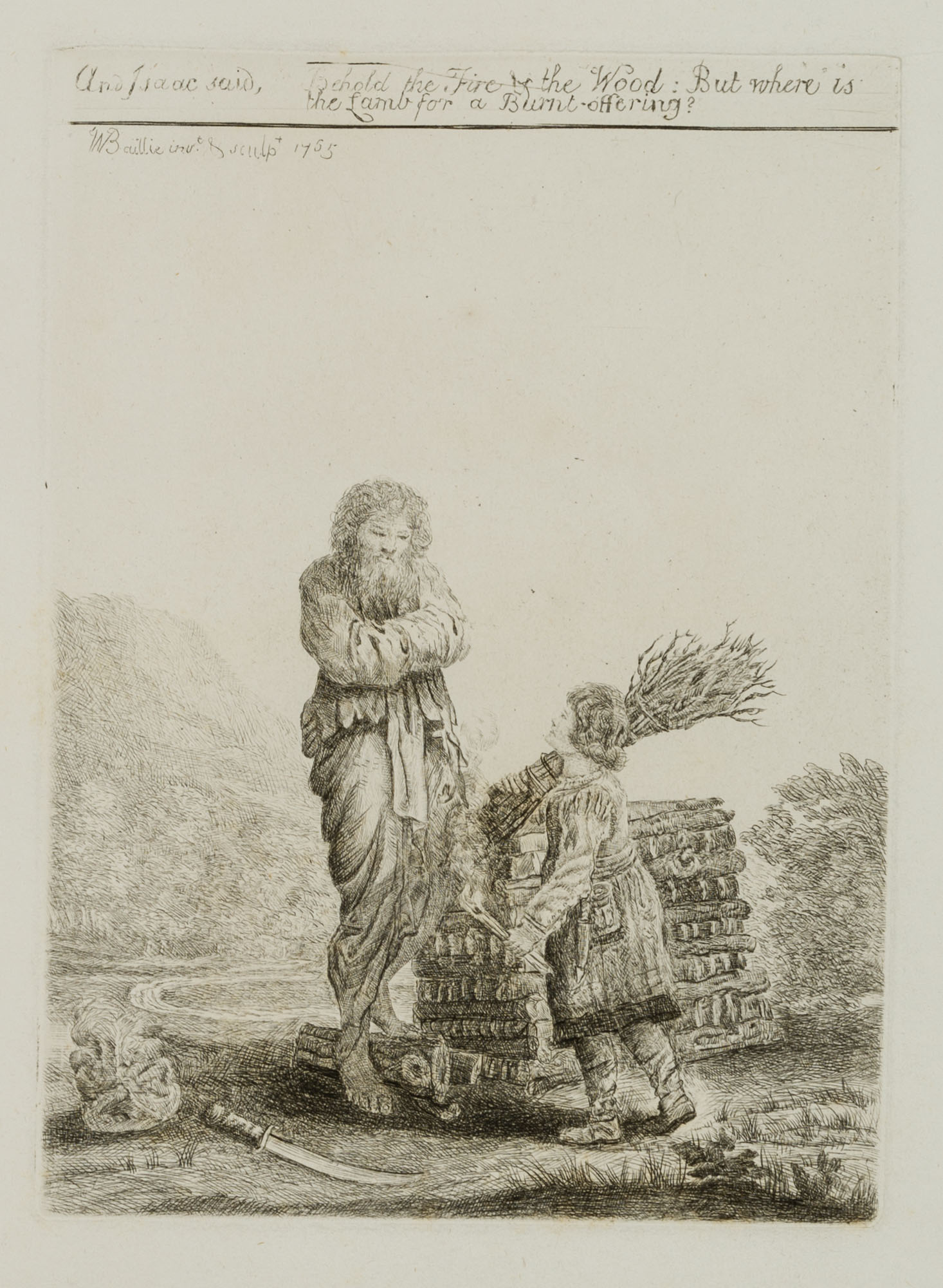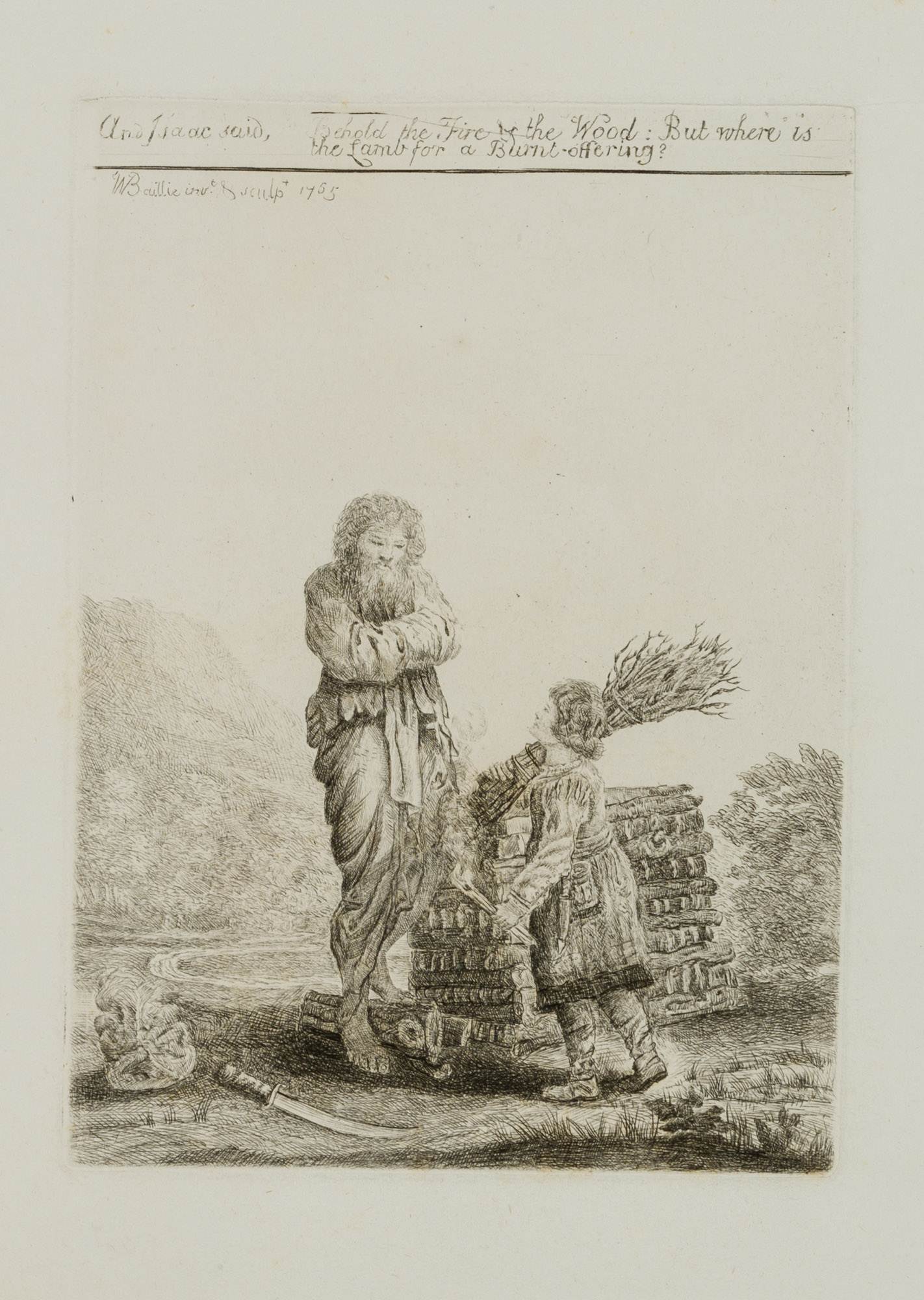 - Description: Inscribed above the image in the plate: “And Isaac said, Behold the Fire & the Wood: But where is the Lamb for a Burnt-offering? / WBaillie invt. & Sculpt 1765”. Abraham and Isaac (Gen.XXII) prepare the sacrifice; standing beside a woodpile, the knife can be seen on the meadow floor in the foreground. Isaac holds a bundle of kindling on his shoulders, a torch in his left. He looks up at his father, who is looking at him sadly with folded arms.