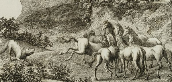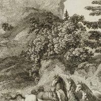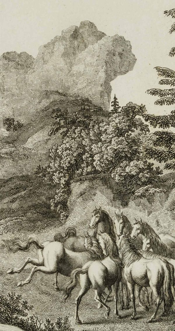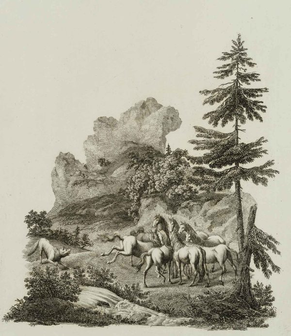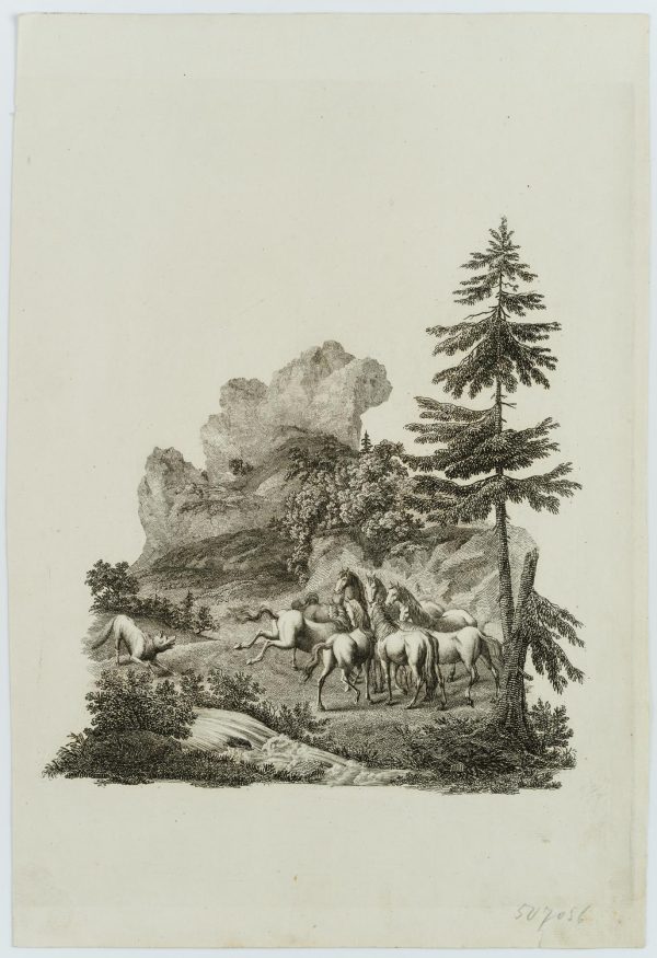 - Description: The study shows eight horses in a rocky river landscape, a dog to the left has kept them alert. From: Leipzig, Seeger: “Belehrende Ideen für angehende Pferdezeichner und zum Vergnügen für Pferdeliebhaber, 1799.”; inscribed in lead at lower right: “507056”. About the artist: Carl Moritz Berggold made a name for himself especially in depicting horses and battles and was also active as a draughtsman (ink, chalk). In 1826 a series of 12 etchings “Studien für Pferderzeichner” was published, executed by Carl Frosch. Also known (among others): 6 etchings “Landschaften mit Reitern” after Georg Philipp Rugendas. Teacher at the Leipzig Academy until his death.