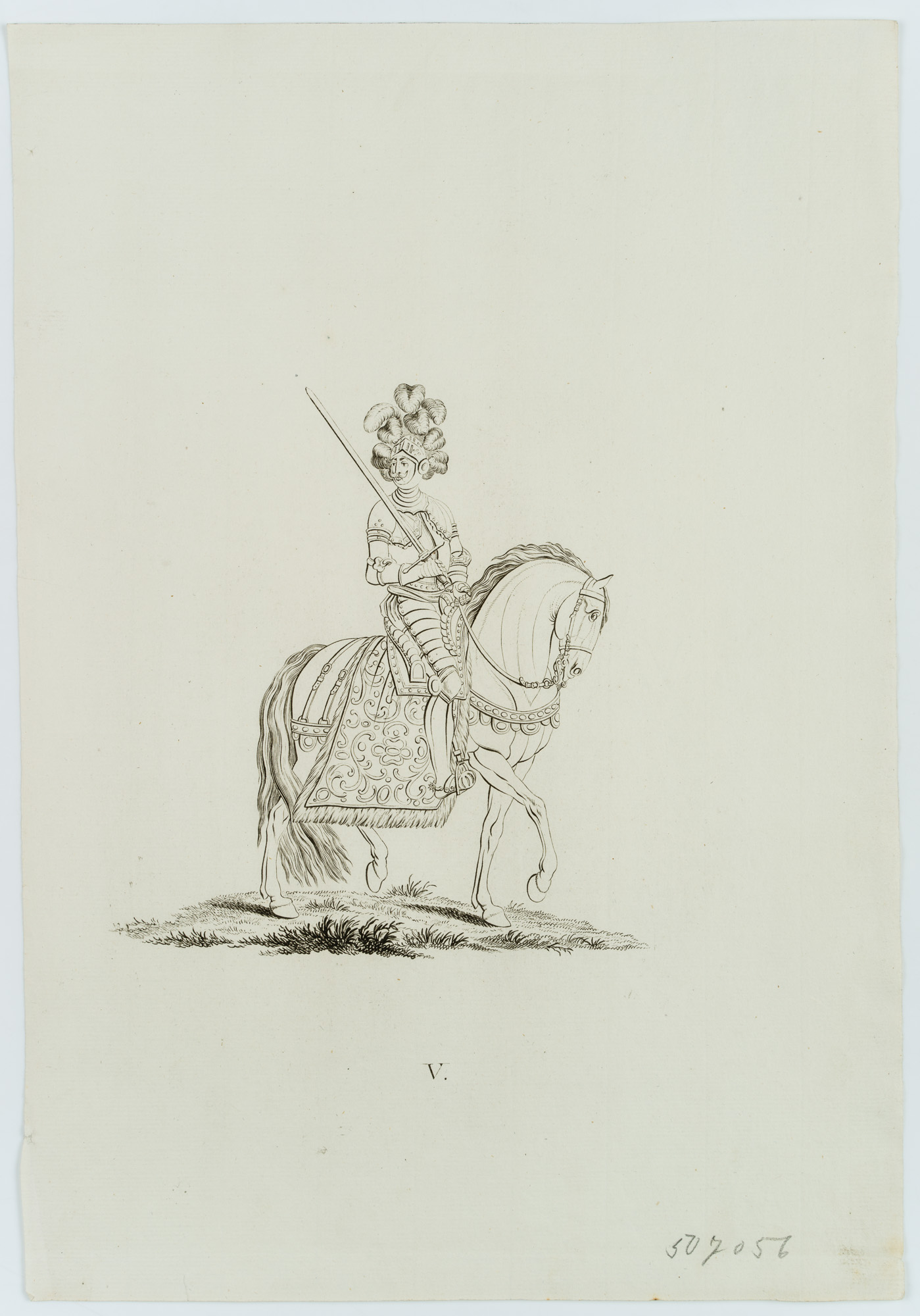 - Beschreibung: Die Darstellung zeigt einen Ritter zu Pferde, aus einem Buch, unten mittig paginiert: “V.”, unten rechts in Blei bezeichnet: “507056”. Wasserzeichen: VANDERLEY
