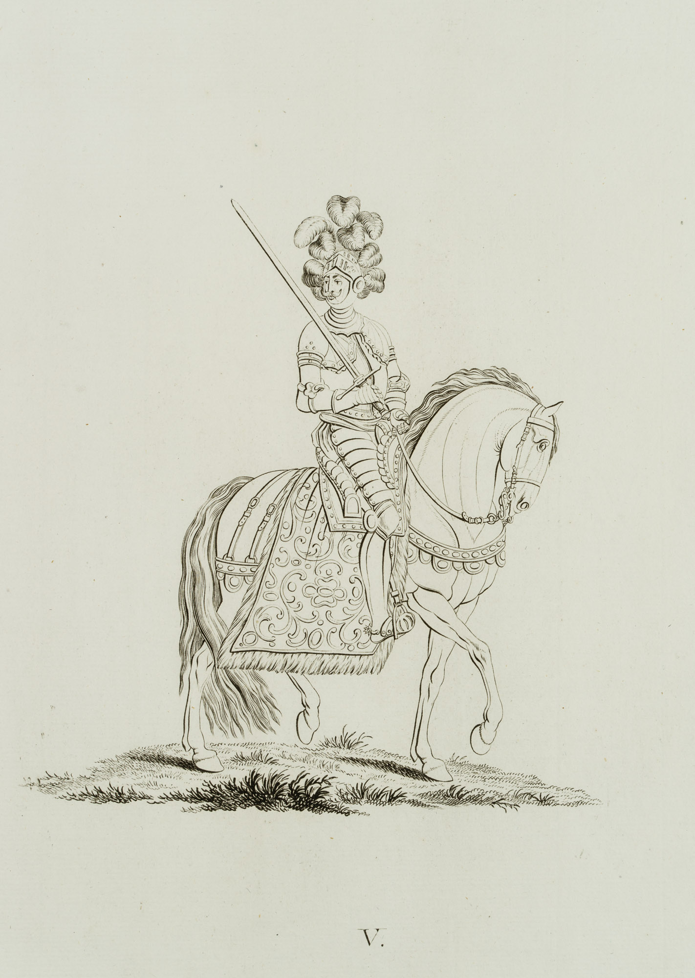 - Description: The depiction shows a knight on horseback, from a book, paginated lower centre: “V.”, inscribed lower right in lead: “507056”. Watermark: VANDERLEY