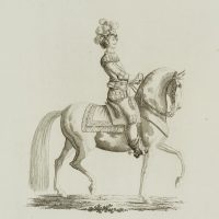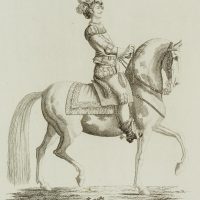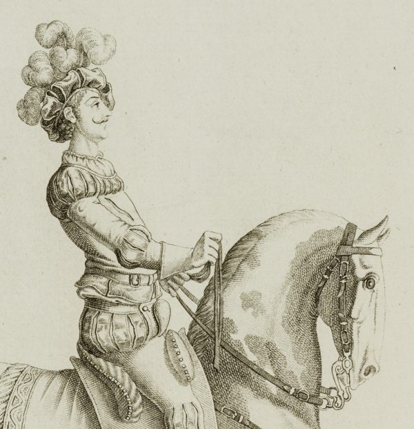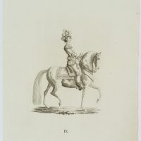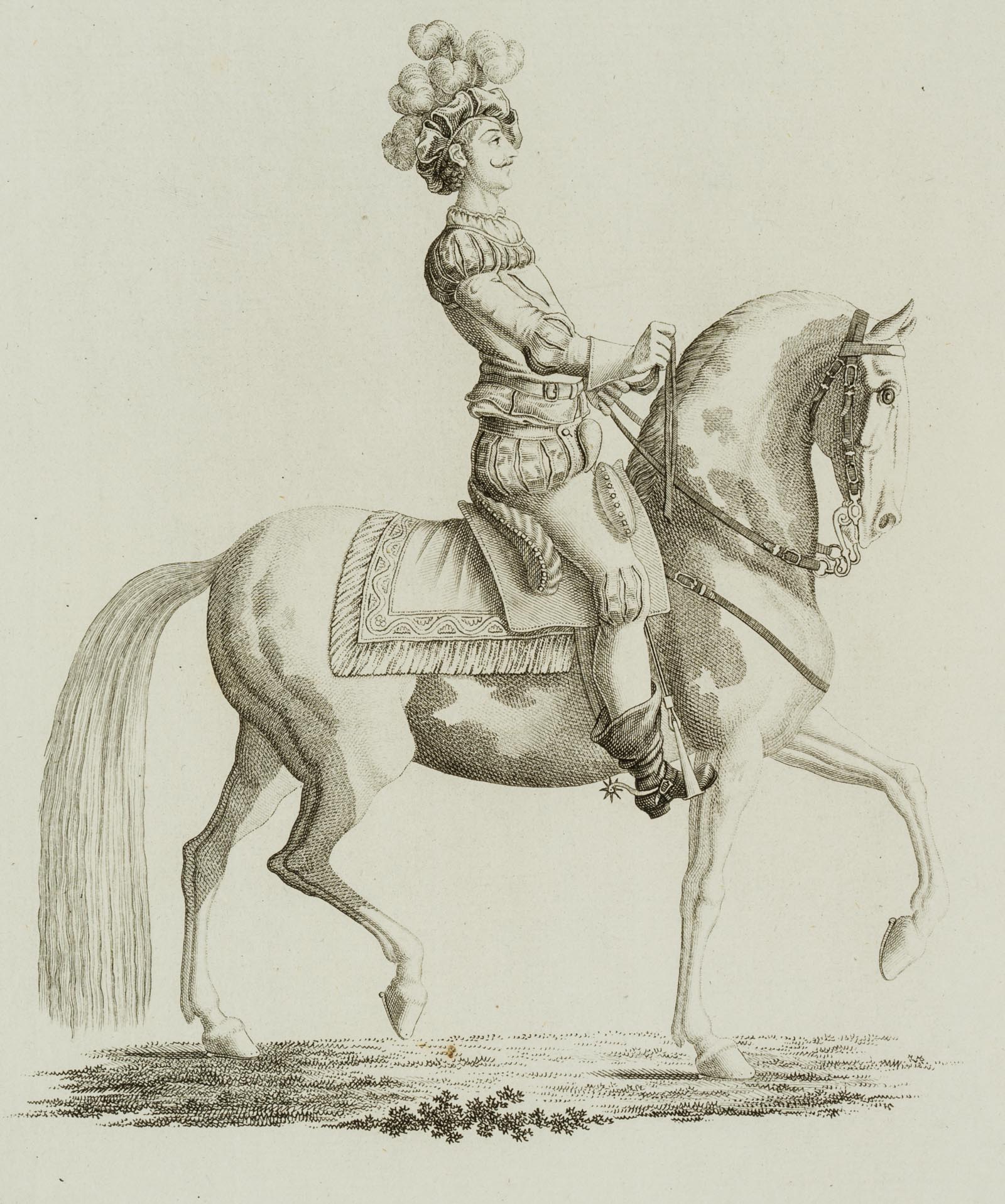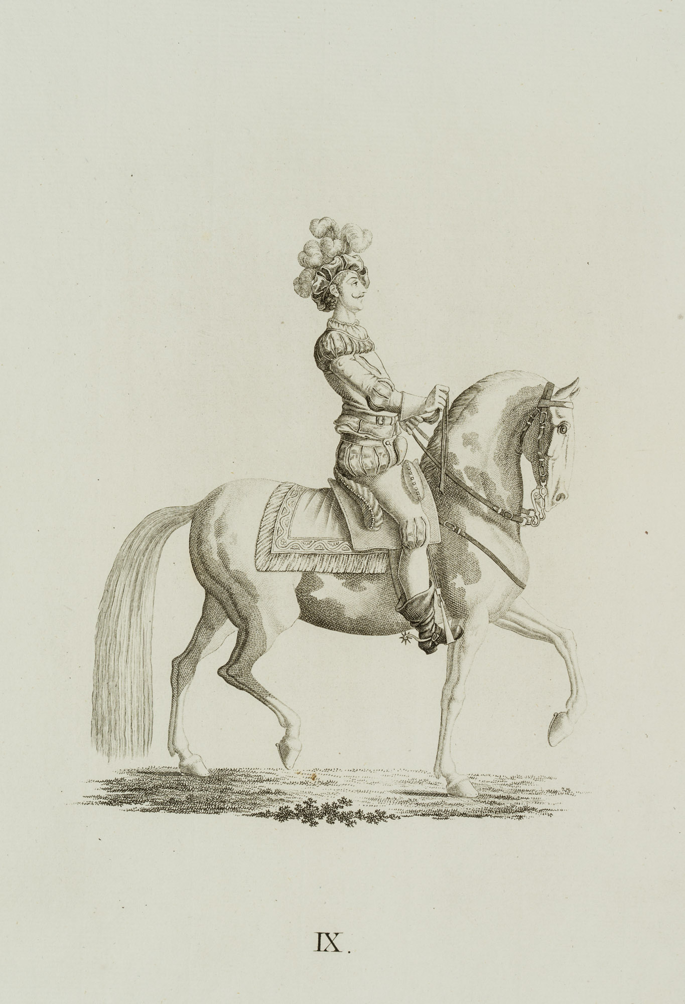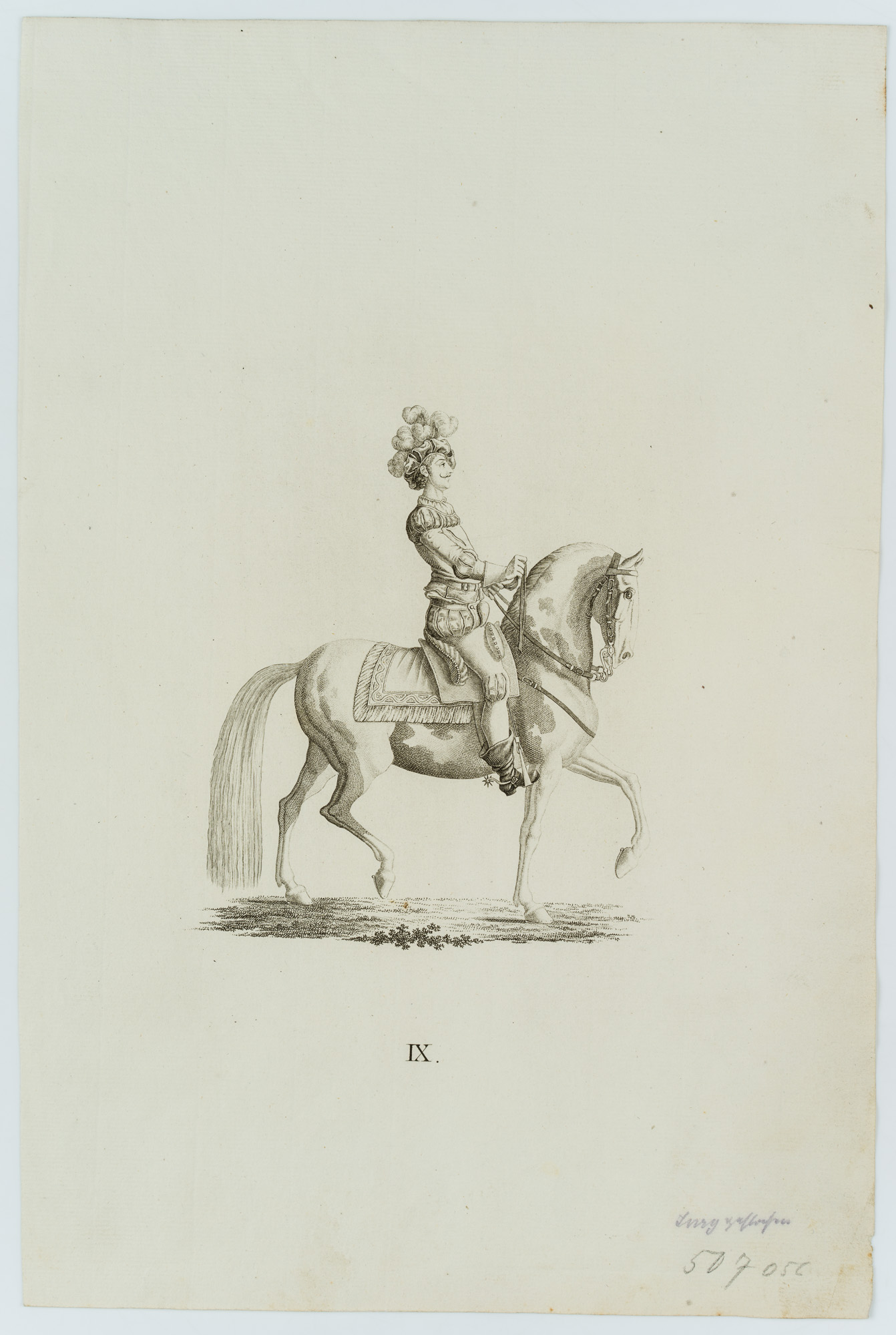 - Description: The depiction shows a rider in courtly costume on horseback. From: Leipzig, Seeger: “Belehrende Ideen für angehende Pferdezeichner und zum Vergnügen für Pferdeliebhaber, 1799.”; paginated lower centre within the printing plate: “IX.”, inscribed in lead on the right: “507056”. Watermark: VANDERLEY