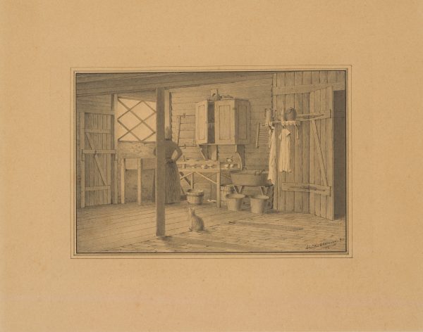 In the foreground, where the floorboards meet the tiles, sits the house cat, which may have just slipped through the door open at the right edge of the picture. The housewife is standing at the window, which is lit by daylight, and seems to be busy washing the dishes. However, she has just paused in her work and is thoughtfully drying her hands on her apron. Her gaze is fixed on the window. The romantic, yearning character of the window gaze does not break through here, however, nor does the melancholy of quiet loneliness. In her posture in the mundane corner, she remains explicitly anchored in the here and now. The viewer cannot decipher whether she is indulging in a daydream or gazing longingly at the street, for the artist not only depicts the woman with her back to us, he also covers the left half of her body facing the window with a support of the ceiling beam and the view out of the window remains empty. It is left to one’s own imagination to guess the lady’s state of mind. - Keywords: Denmark, Copenhagen, drawing, ink, pen, interior, interior, kitchen, woman, house, room, room, cat, home, 19th century, Realism, Costumes, Denmark,