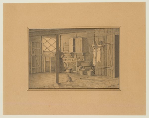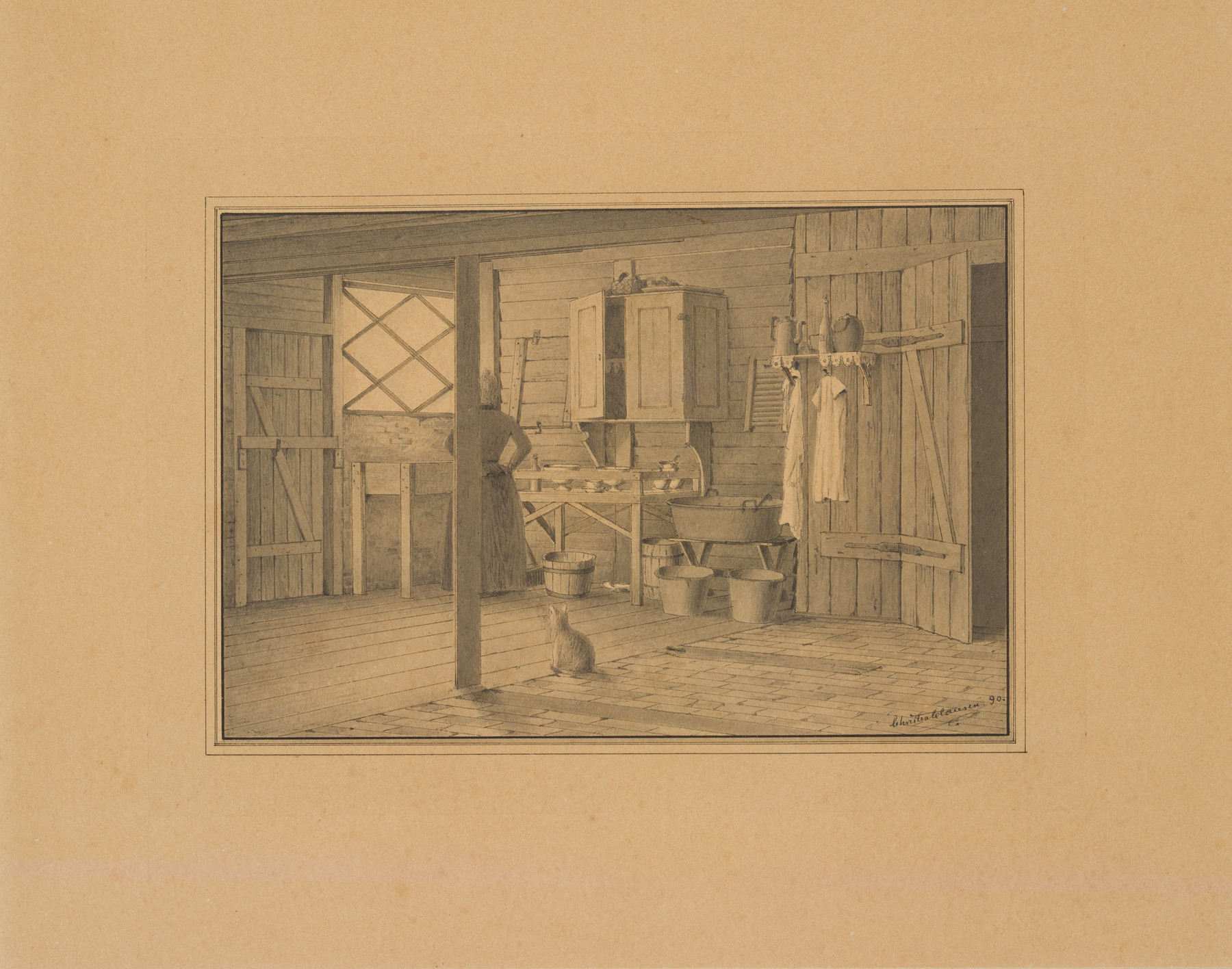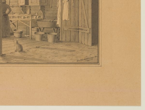 Im Vordergrund, wo die Bodenbretter mit den Fliesen zusammentreffen, sitzt die Hauskatze, die gerade durch die am rechten Bildrand geöffnete Türe geschlüpft sein mag. Die Hausfrau steht an dem vom Tageslicht erhellten Fenster und scheint mit dem Abwasch beschäftigt. Sie hält jedoch gerade in ihrer Arbeit inne und trocknet sich gedankenverloren die Hände an der Schürze. Ihr Blick ist auf das Fenster gerichtet. Der romantisch-sehnsuchtsvolle Charakter des Fensterblicks bricht hier allerdings ebenso wenig durch, wie die Melancholie der stillen Einsamkeit. In ihrer Haltung in dem profanen Winkel bleibt sie ausdrücklich im Hier und Jetzt verankert. Ob sie sich einem Tagtraum hingibt oder sehnend auf die Straße blickt, kann der Betrachter nicht entschlüsseln, denn der Künstler stellt die Frau nicht nur mit dem Rücken zu uns dar, er verdeckt dazu noch die linke, dem Fenster zugewandte Körperhälfte durch eine Stütze des Deckenbalkens und der Blick aus dem Fenster bleibt leer. Es ist der eigenen Vorstellungskraft überlassen, den Gemütszustand der Dame zu erraten. - Schlagworte: Dänemark, Kopenhagen, Zeichnung, Tusche, Feder, Interieur, Inneraum, Küche, Frau, Haus, Raum, Zimmer, Katze, Heim, Trachten, Genre, Dänemark, Realismus, 1850-1899