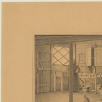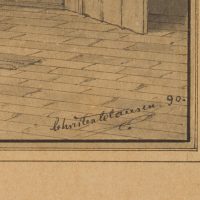 Der dänische Maler Christian Clausen schilderte hauptsächlich wirklichkeitsgetreue Szenen aus dem alltäglichen Leben in der Hauptstadt Kopenhagen. So gewährt er uns auch in diesem Blatt Einblick in einen zwar weniger repräsentativen denn privaten, heimeligen Ort: einen Hauswirtschaftsraum mit dem großen Zuber, dem Waschbrett, den Bottichen unter den Waschtischen und dem Trockenschrank an der Wand darüber. Die Wände, Türen, Decken und der Boden sind zum größten Teil aus Brettern gezimmert. Die bauliche Situation der einfachen Szene erlaubte Clausen auch eine kleine Kaprice, denn sein Interesse bei dieser Darstellung galt offensichtlich auch dem besonderen Reiz der geometrischen Ausrichtung der Baumaterialien, vor allem der verschiedenen Bretterarten im Raum, die er mit besonderer Detailgenauigkeit wiedergibt. Dieser Kunstgriff ist sicherlich auch seiner 1880 begonnenen Architektenausbildung geschuldet. Die Präzision der Zeichnung und Klarheit der Komposition legt den Gedanken an die Arbeiten seines Landsmannes Christoffer Wilhelm Eckersberg nahe. Die ruhige Stimmung, das In-sich-Verharren wiederum rückt das Blatt in die Nähe der melancholisch-mysteriösen Interieurs seines ebenfalls aus Dänemark stammenden Zeitgenossen Vilhelm Hammershøi.