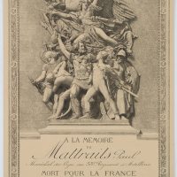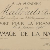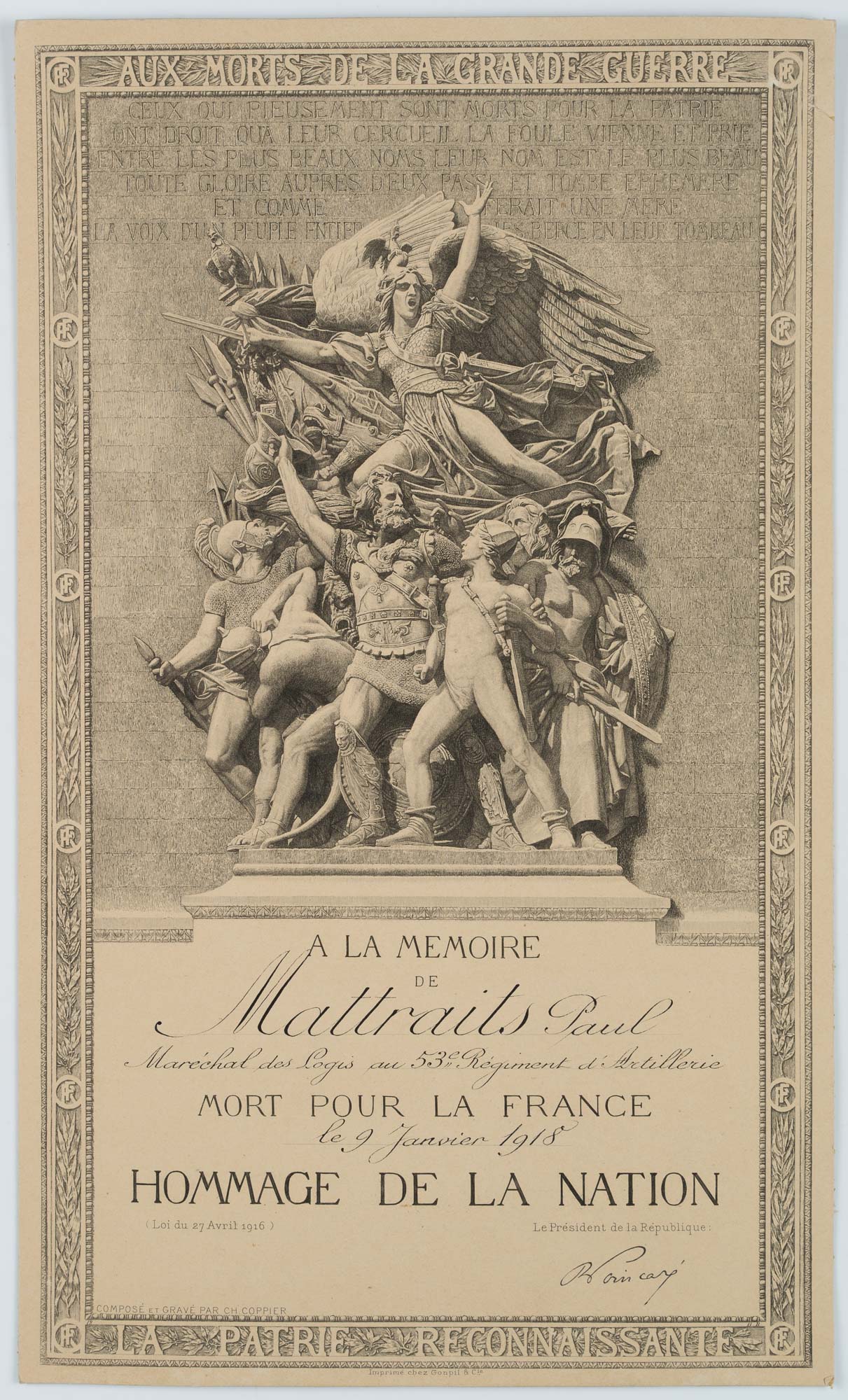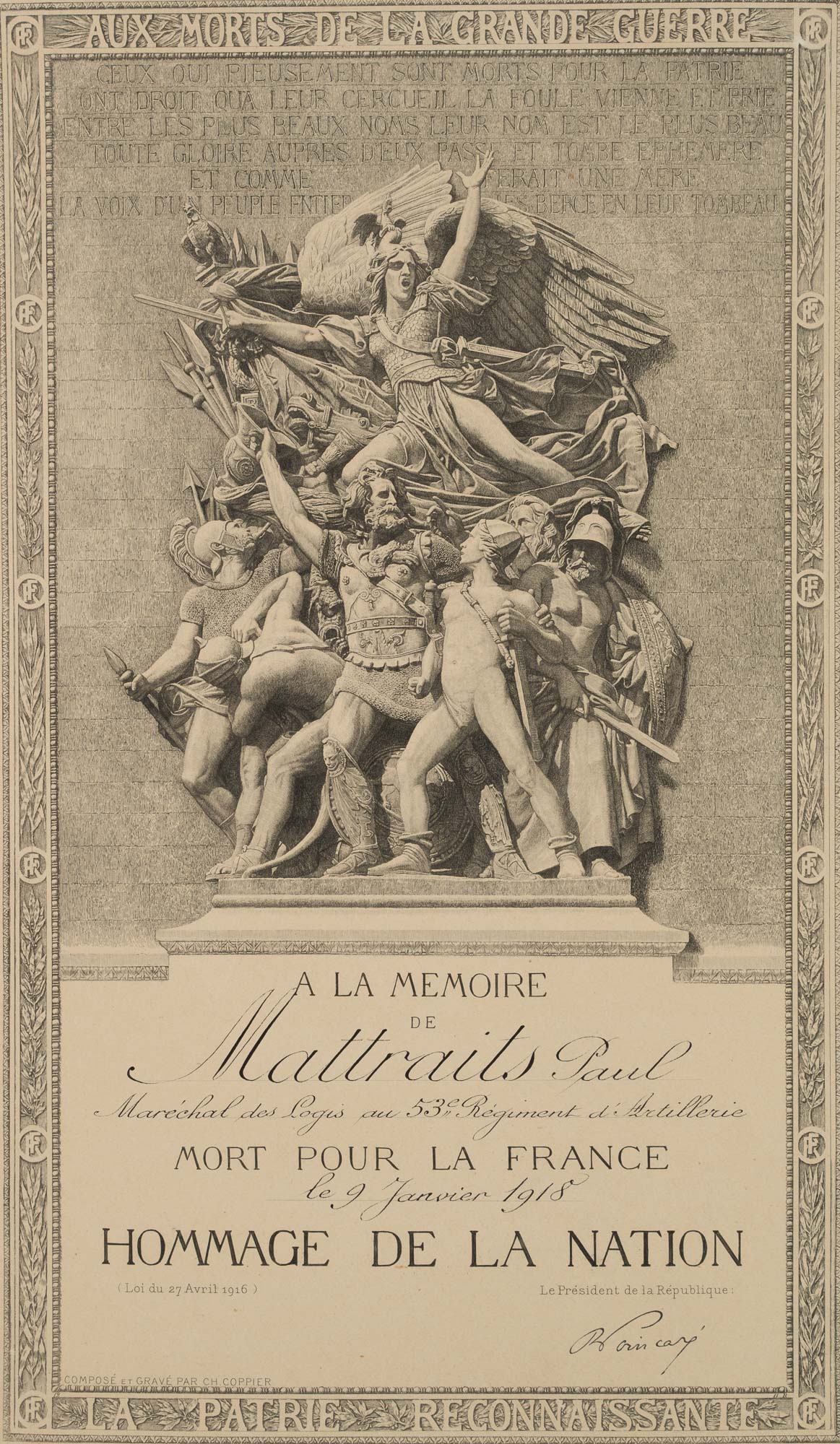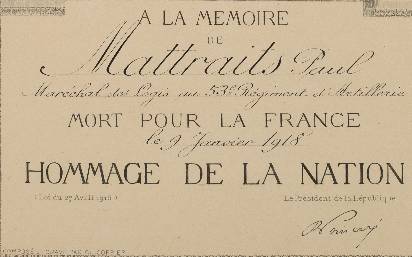 - Description: Kriegerdenkmal zur Erinnerung an Mattraits Paul, unter der Darstellung bezeichnet: “A la memoire de Mattraits Paul, Maréchal des Logis au 53.e Régiment d’Artillerie / Mort Pour La France / le 9 Janvier 1918 / Hommage de la Nation / Loi du 27 Avril 1916”. rechts mit faksimilierter Unterschrift: “Le Président de la République: RPoincaré (Raymond Poincaré)”. Unten links signiert “Composé et gravé par Ch. Coppier” unten mittig: Imprimé chez Goupil & Cie”.