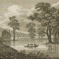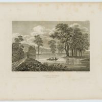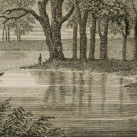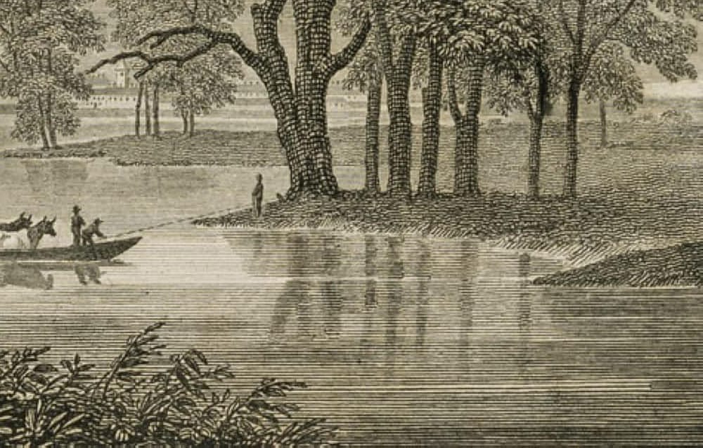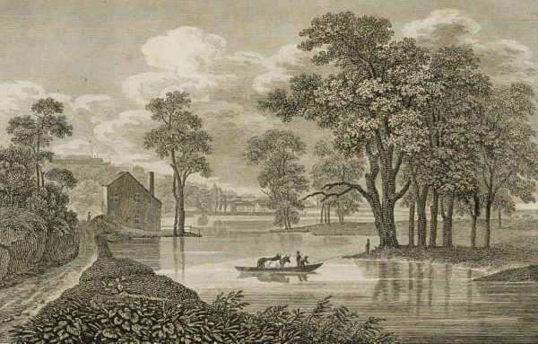 - Beschreibung: Darsgestellt ist das Übersetzen zweier Kühe über einen Fluss in Albany.