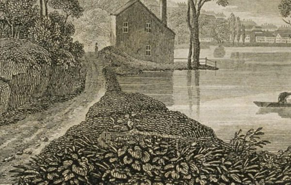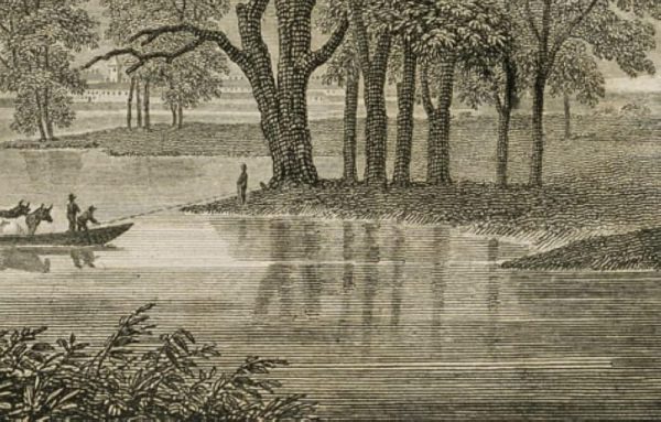 - Description: Depicted is the crossing of two cows over a river in Albany.