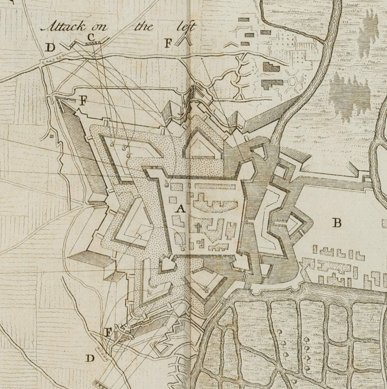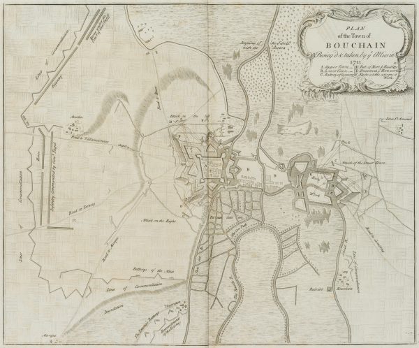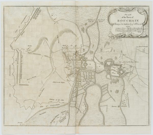 - Bezeichnung: Oben rechts in der Kartusche beschriftet mit “PLAN of the Town of BOUCHAIN besieged & taken by the Allies in 1711”. Das vorliegende Blatt dokumentiert anhand der militärischen Karte, wie die Alliierten 1711 im Rahmen des spanischen Erbfolgekriegs die französische Stadt Bouchain in Nordfrankreich eroberten.