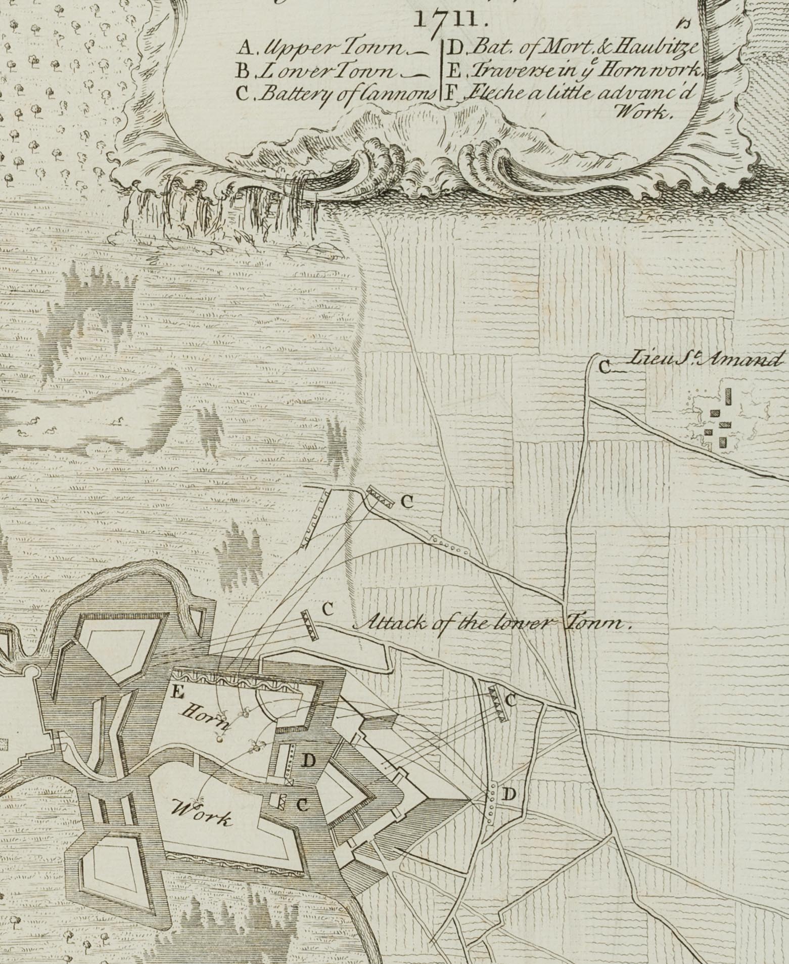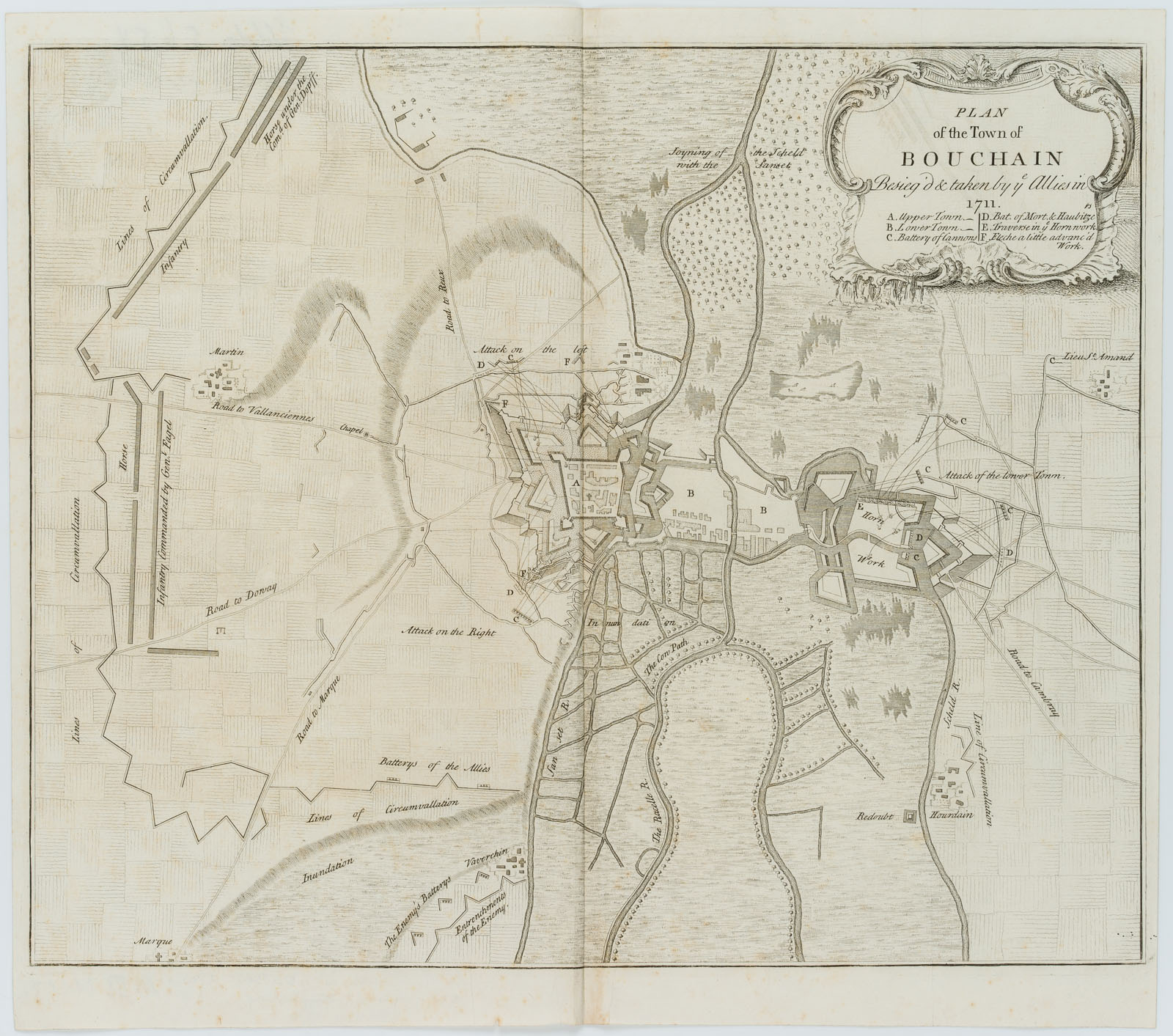 - Inscription: Inscribed in the upper right cartouche with “PLAN of the Town of BOUCHAIN besieged & taken by the Allies in 1711”. This sheet uses the military map to document how the Allies captured the French town of Bouchain in northern France in 1711 as part of the War of the Spanish Succession.