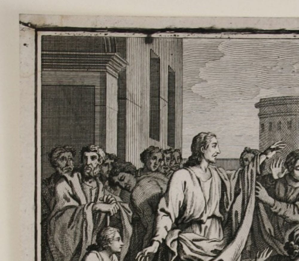• Beschreibung: Claude-Augustin Duflos, Erweckung zu Nain, Kupferstich, um 1750. Beschreibung: Kupferstich von Claude-Augustin Duflos, bezeichnet unten rechts: “Cl. Duflos fec. “, darunter: “Lucas VII. Opwecking van de Zoon ener Weduwe tot Nain. Le Fils d`une Veuve de Nain rescuscité”. Umringt von einer Volksmenge kniet die Witwe zu Nain vor ihrem Sohn, den Jesus soeben erweckt hat. Claude-Augustin Duflos war (1700 Paris -1786 Paris) französischer Kupferstecher und Schüler von Bernard Picart.