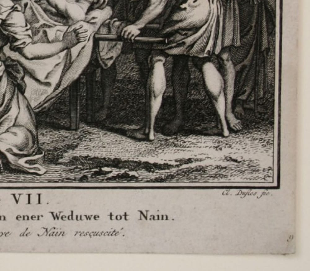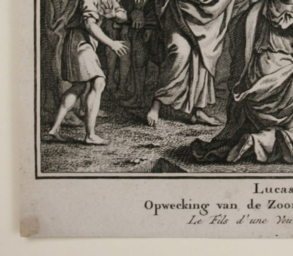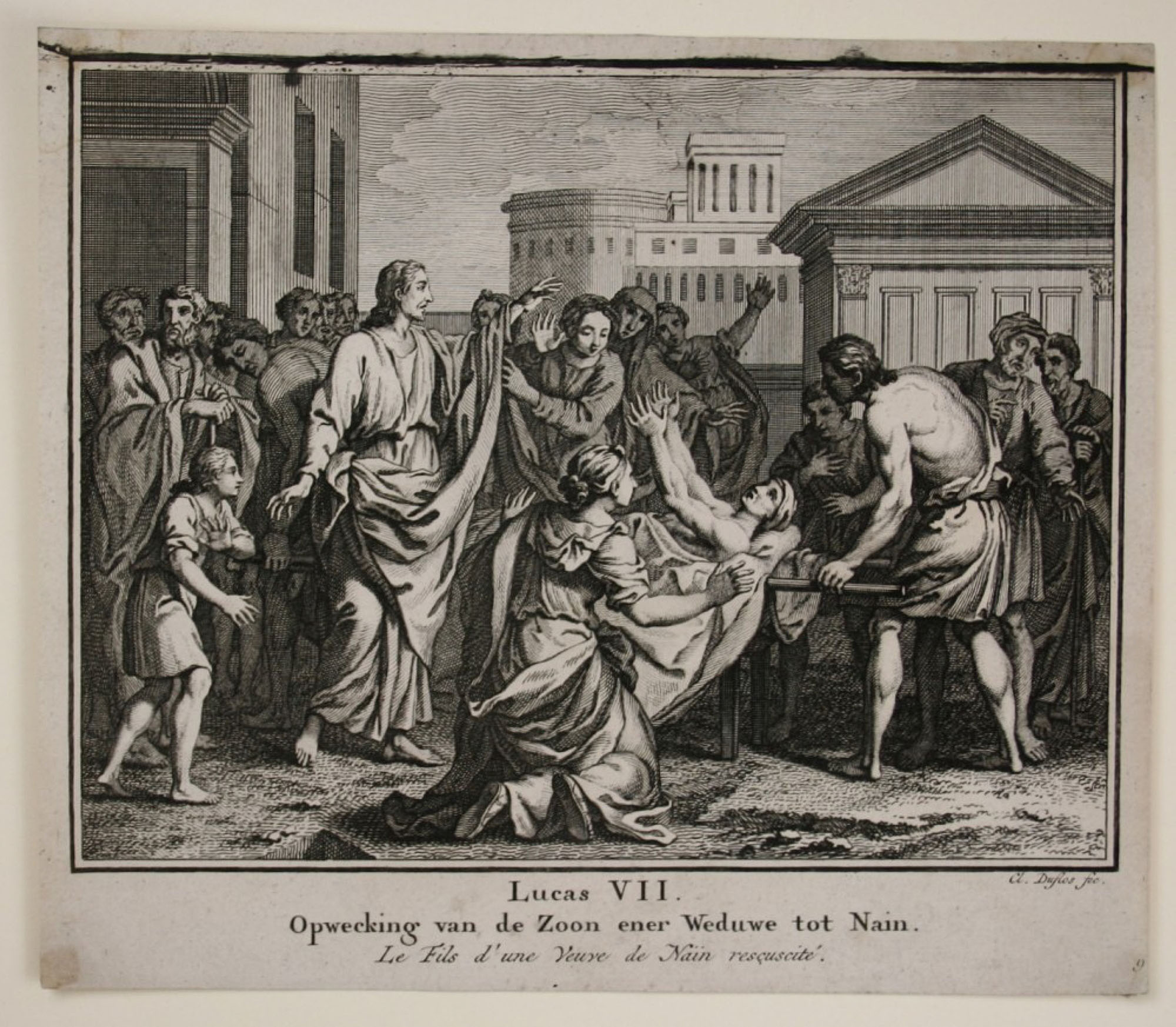 • Description: Claude-Augustin Duflos, Revival at Nain, copper engraving, c. 1750. Description: Copper engraving by Claude-Augustin Duflos, inscribed lower right: “Cl. Duflos fec. “, below: “Lucas VII Opwecking van de Zoon ener Weduwe tot Nain. Le Fils d`une Veuve de Nain rescuscit”. Surrounded by a crowd of people, the widow of Nain kneels before her son, whom Jesus has just raised. Claude-Augustin Duflos was (1700 Paris -1786 Paris) a French engraver and pupil of Bernard Picart.