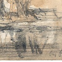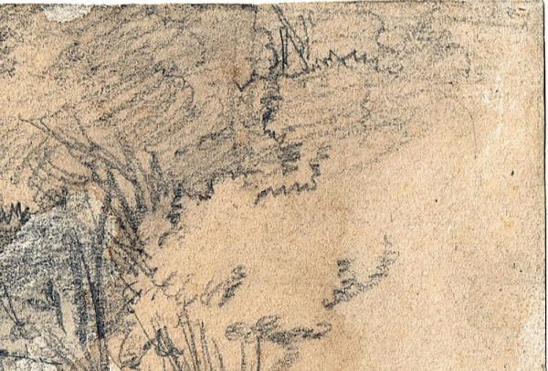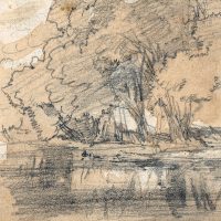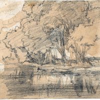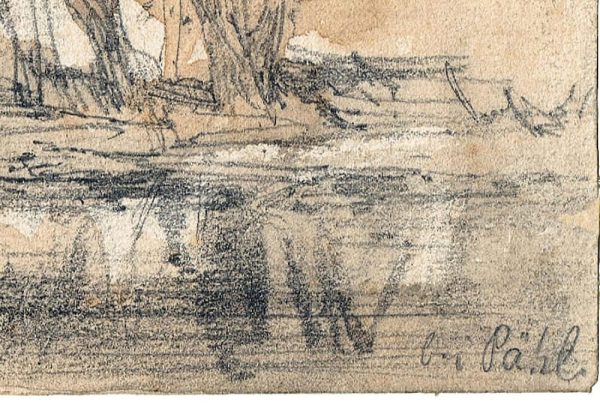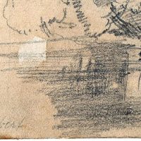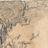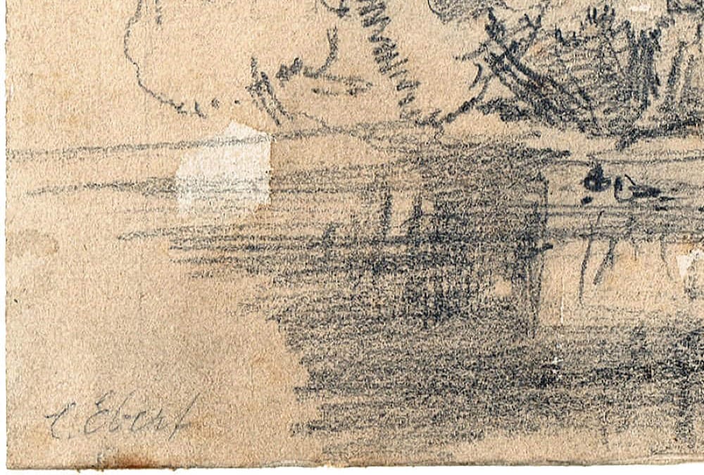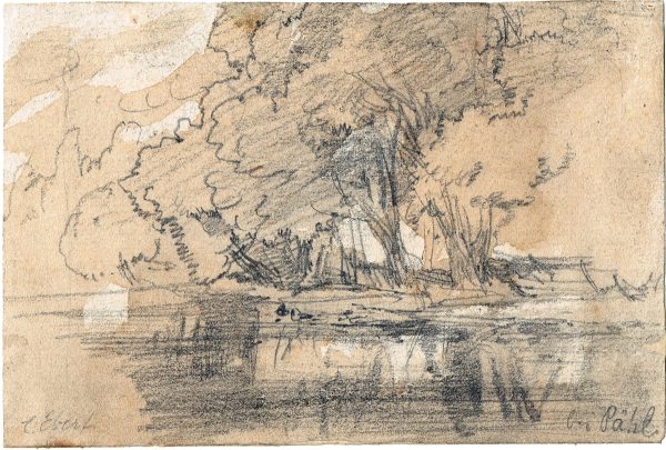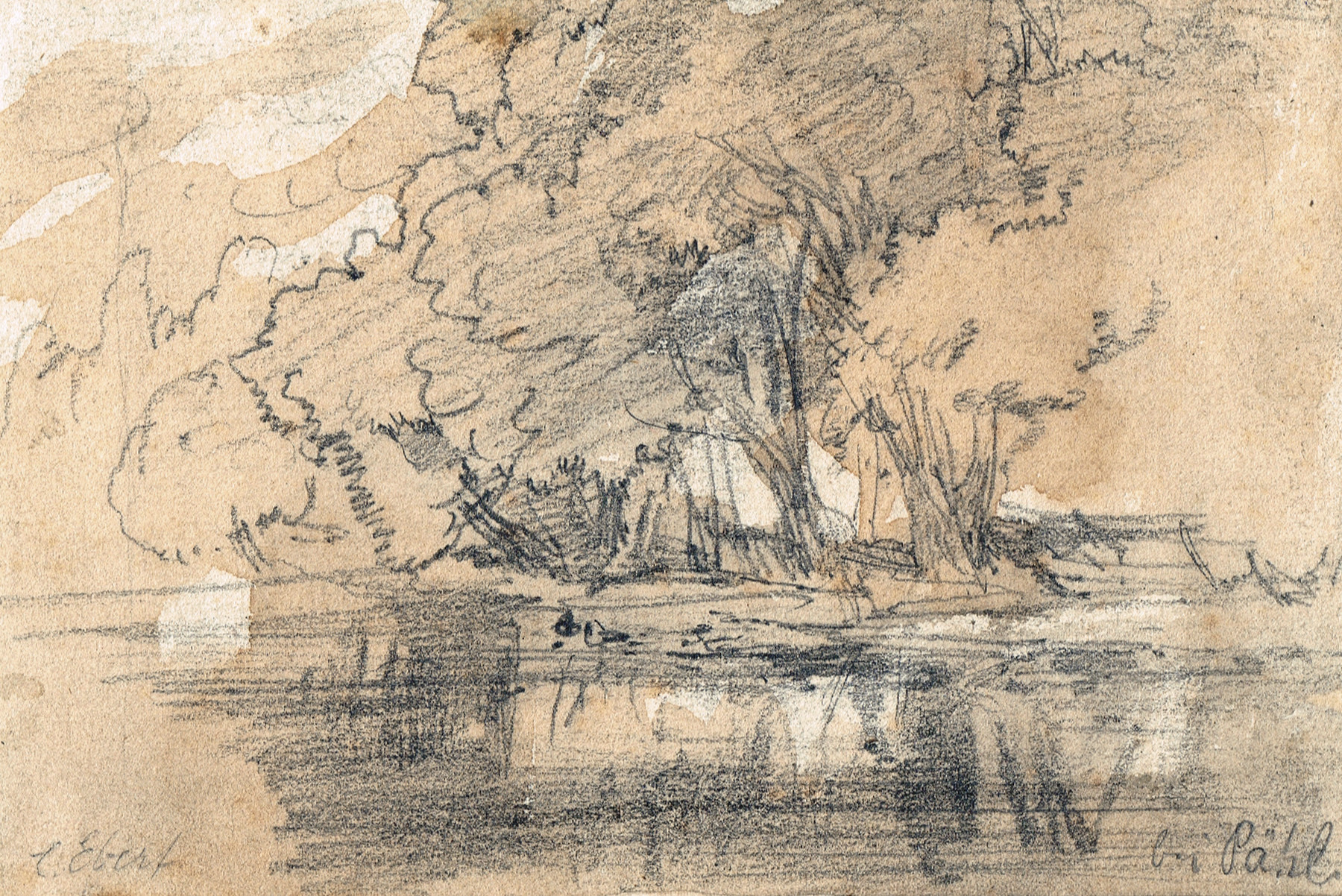 In seiner kleinen Skizze befreit sich Ebert vollkommen von dieser Auffassung der Landschaft. Er entdeckt den Reiz des unscheinbaren Motivs und baut zu ihm eine fast intime Beziehung auf. Es ist eine Landschaft bei Pähl zwischen dem Ammersee und dem Starnberger See, ein häufiges Ausflugsziel der Münchner Künstler. Es könnte aber überall sein, Ebert gibt hier keine gestalterische Definition des Ortes. Die Linien sind frei, dem Licht wird kein fester Platz zugewiesen. Die Natur ist in Bewegung, sie lebt. Es ist sein Loblied auf die Freilichtmalerei, die das klassische System der Akademieausbildung bald revolutionieren wird. - Schlagworte: Flusslandschaft, Auenwald, Bayern, Ammersee, Landschaft, , Moderne, 1800-1849