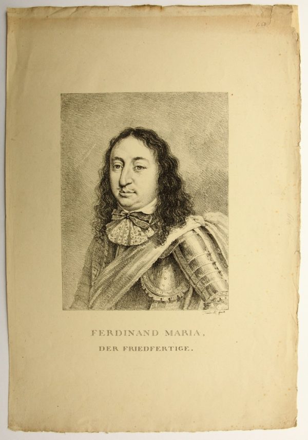 - Description: Ch. FRANCK (19th century, France), Portrait of a bust in three-quarter profile of Ferdinand Maria of Bavaria, called the Peace Lover(1636 Munich – 1679 Schleißheim), from 1651 Elector of Bavaria, lithograph. Description:Lithograph on paper. Signed in stone below the image and inscribed with the sitter’s name and epithet.
