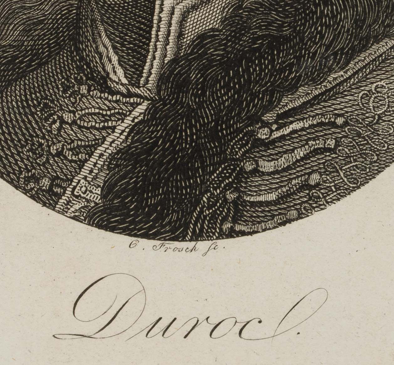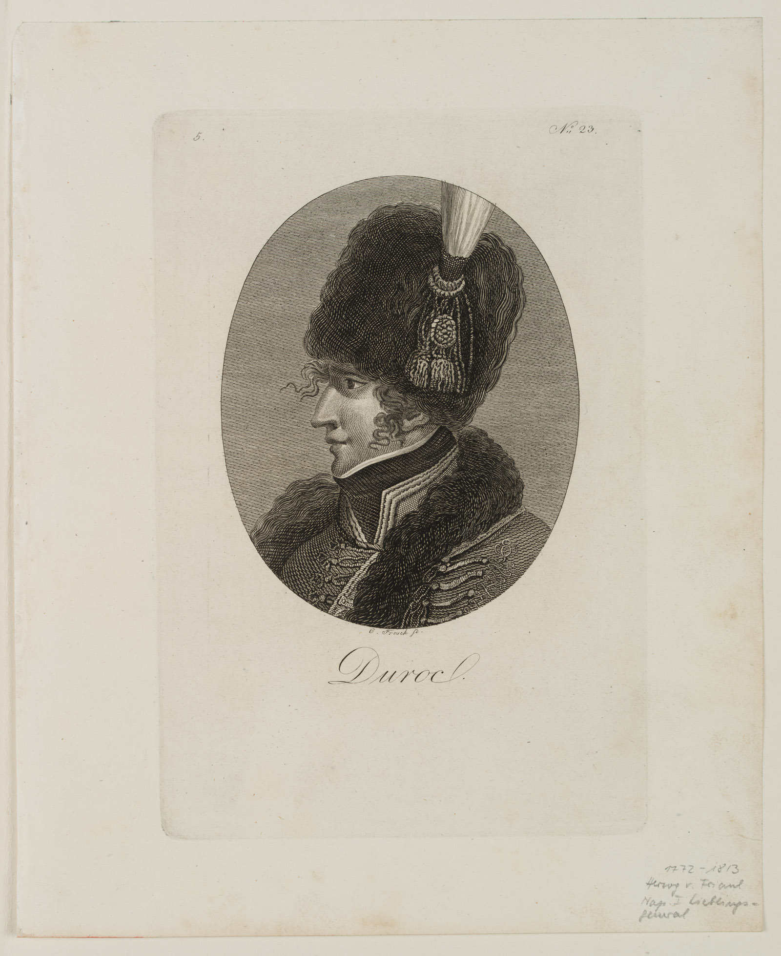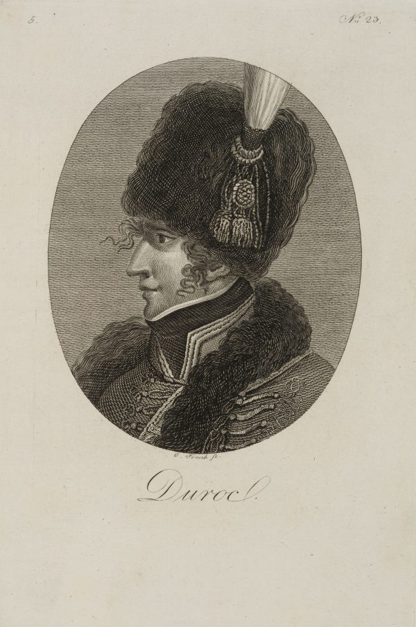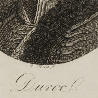 - Bezeichnung: Unten betitelt “Duroc”; unten rechts mit Bleistift handschriftlich bezeichnet mit den Lebensdaten des Dargestellten.