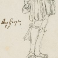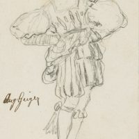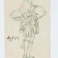 Die schöne Tracht des Dargestellten zeichnet sich besonders durch seine Puffärmel und Puffhosenbeine aus. Caspar Augustin Geiger studierte 1866 an der Königlichen Akademie der Bildenden Künste in München Malerei, unter anderem bei Wilhelm von Diez; fertigte unter anderem vier Kuppelbilder für den Glaspalast in München. - Datierung: 19. Jahrhundert