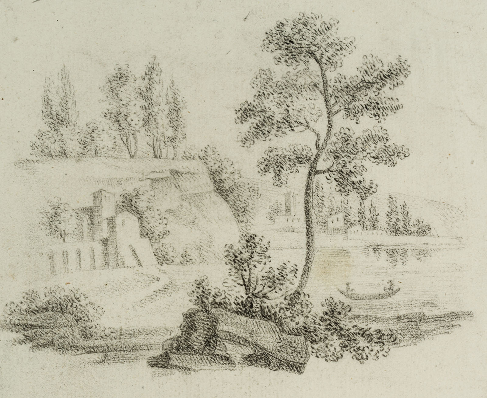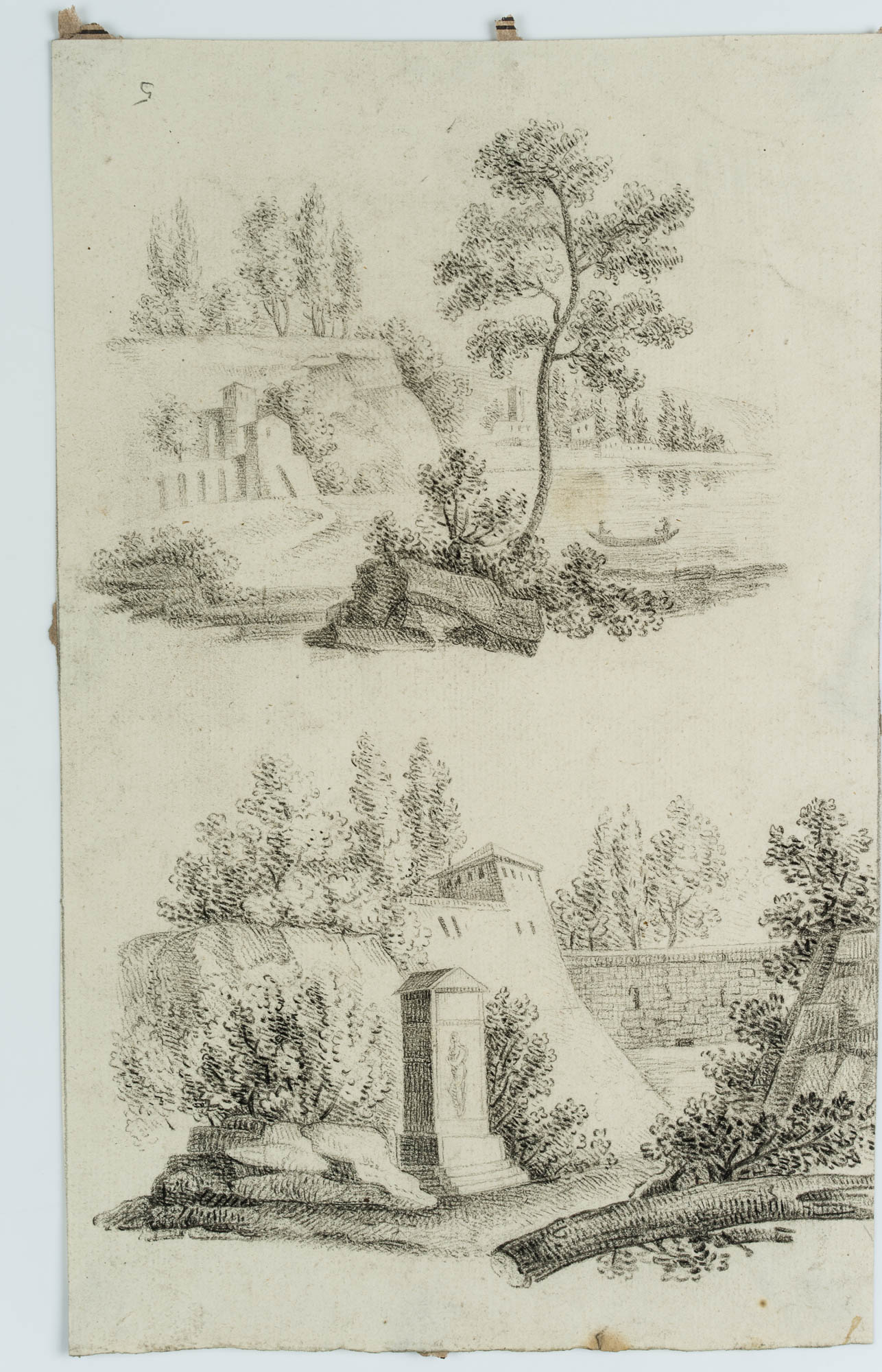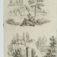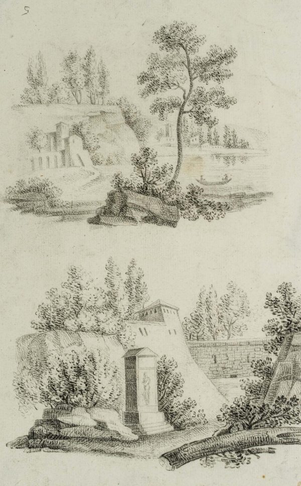 - Description: In the upper drawing, the view leads across a riverside landscape with a rowing boat to a small settlement in the distance. The lower drawing shows a monument with a figure, probably a funerary monument. Watermark on the left side of the paper: “Bages”. | Watermark: “Bages”