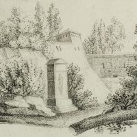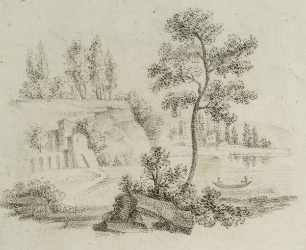 - Beschreibung: In der oberen Zeichnung führt der Blick über eine Uferlandschaft mit Ruderboot auf eine kleine Siedlung in der Ferne. Die untere Zeichnung zeigt ein Denkmal mit Figur, vermutlich ein Grabdenkmal. Wasserzeichen seitlich links im Papier: “Bages”. | Wasserzeichen: “Bages”