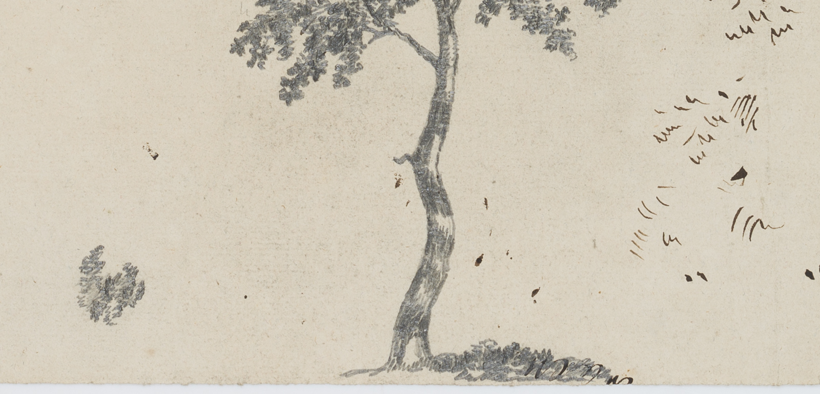 - Description: Louis Charles François de Graimberg (*1774 near Château-Thierry-1864 in Heidelberg) was a Romantic painter and draughtsman who also made a name for himself as a collector, museum founder and monument conservator. His studies of nature bear witness to an intensive engagement with the Romanticists’ ideas of nature. The pencil study shows a young tree with light foliage. In many cases, the motifs of the drawings found their way into the large-format paintings of his adopted home Heidelberg. | Watermark: Wappen (?); Schildkrötenpanzer (?)