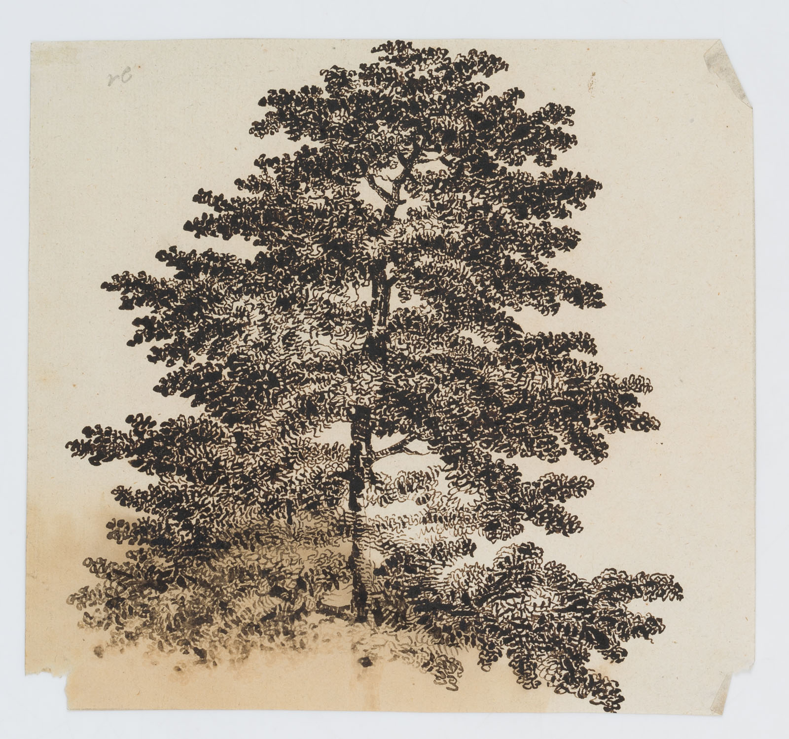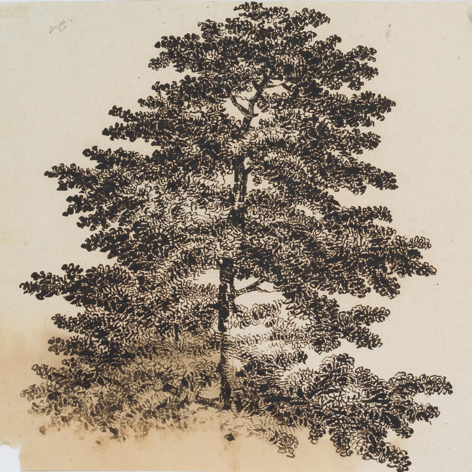 - Description: Louis Charles François de Graimberg (*1774 near Château-Thierry-1864 in Heidelberg) was a Romantic painter and draughtsman who also made a name for himself as a collector, museum founder and monument conservator. His studies of nature bear witness to an intensive engagement with the Romanticists’ ideas of nature. The ink drawing shows a large tree with dense foliage. The motifs of the drawings often found their way into the large-format paintings of his adopted home Heidelberg.