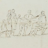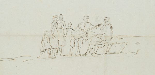 - Beschreibung: Studie in sepiafarbener Tusche einer Gruppe von Frauen Kindern und Männern, die sich um einen sitzenden Lautenspieler versammelt haben.