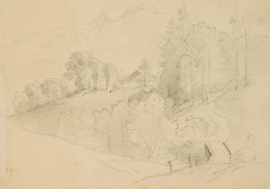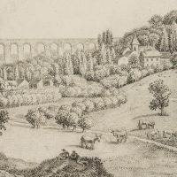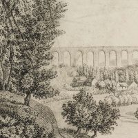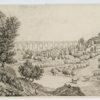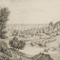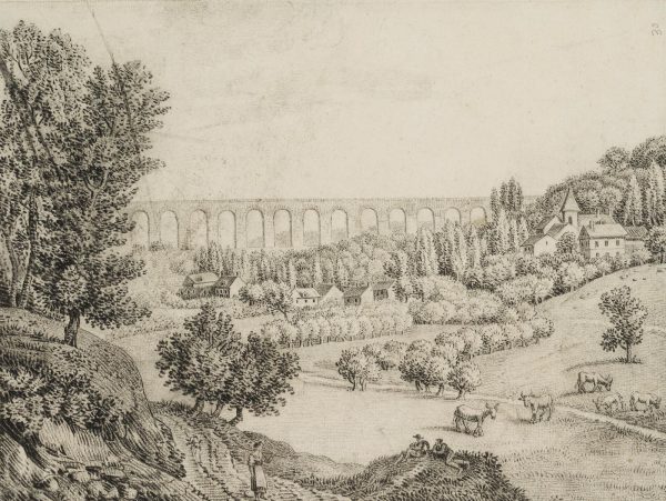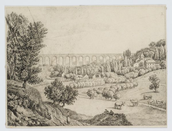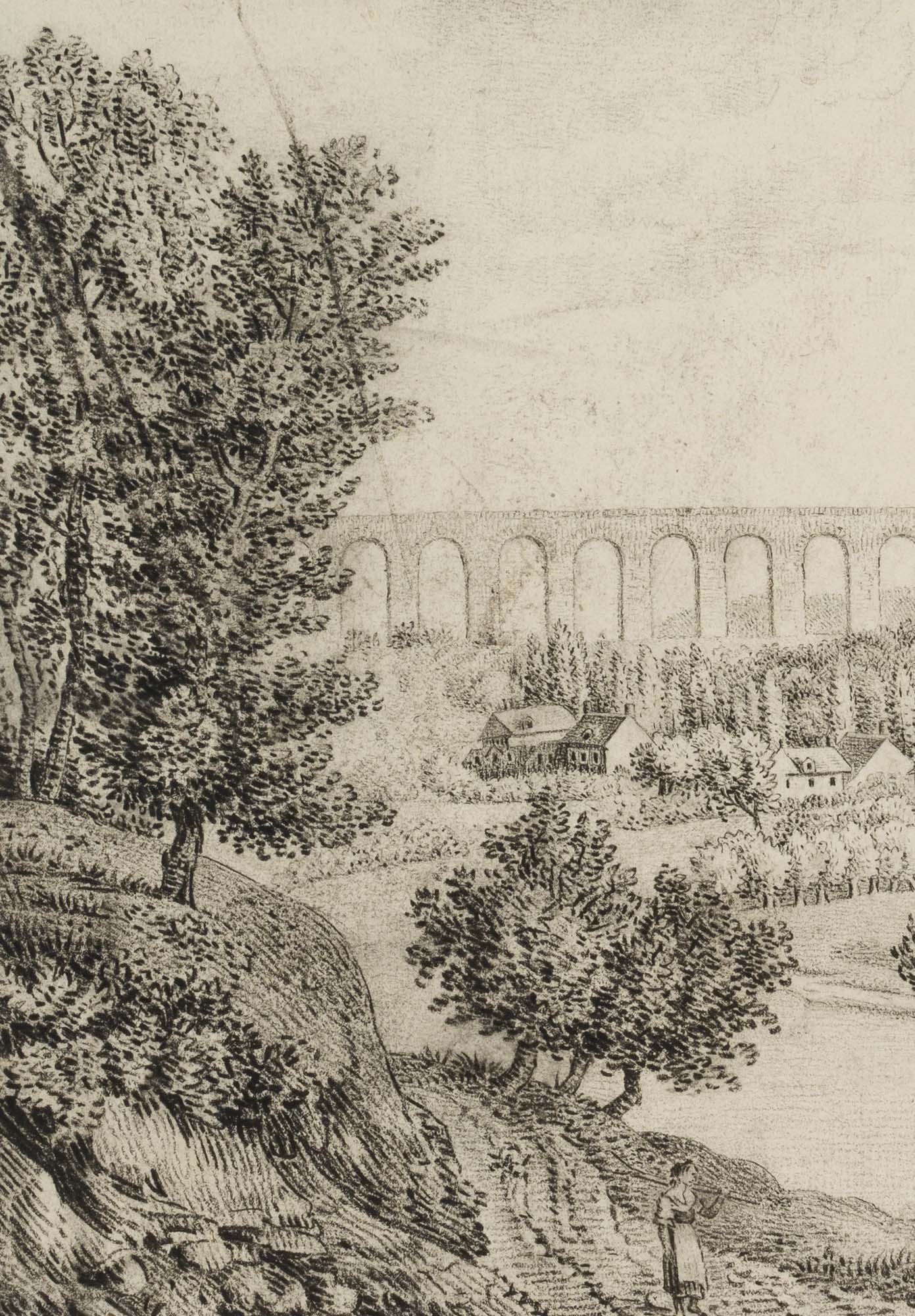 Charles de Graimberg (1774 Purple – 1865 Heidelberg), Landscape with aqueduct, village and farmers, c. 1800, Charcoal