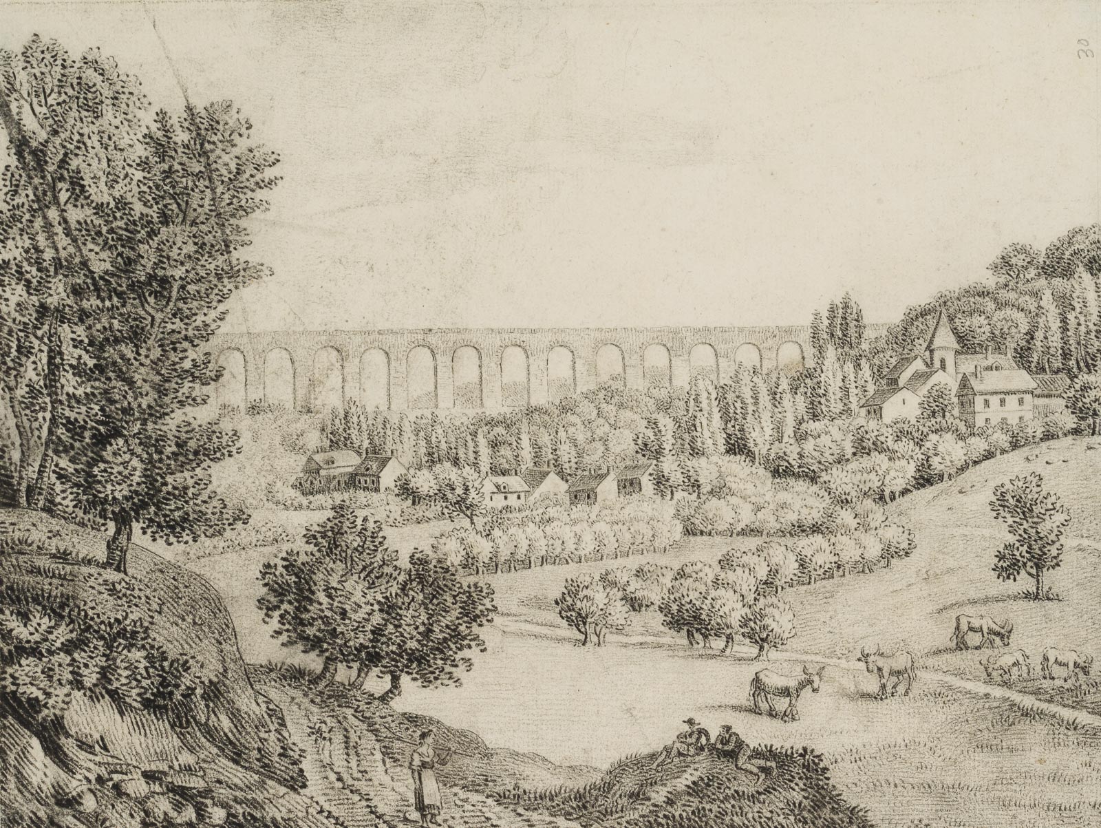 - Schlagworte: Aquädukt, Landschaft, Dorf, Dorfkirche, Bauern, Hirten Vieh, Landschaft, Deutschland, Romantik, 1800-1849