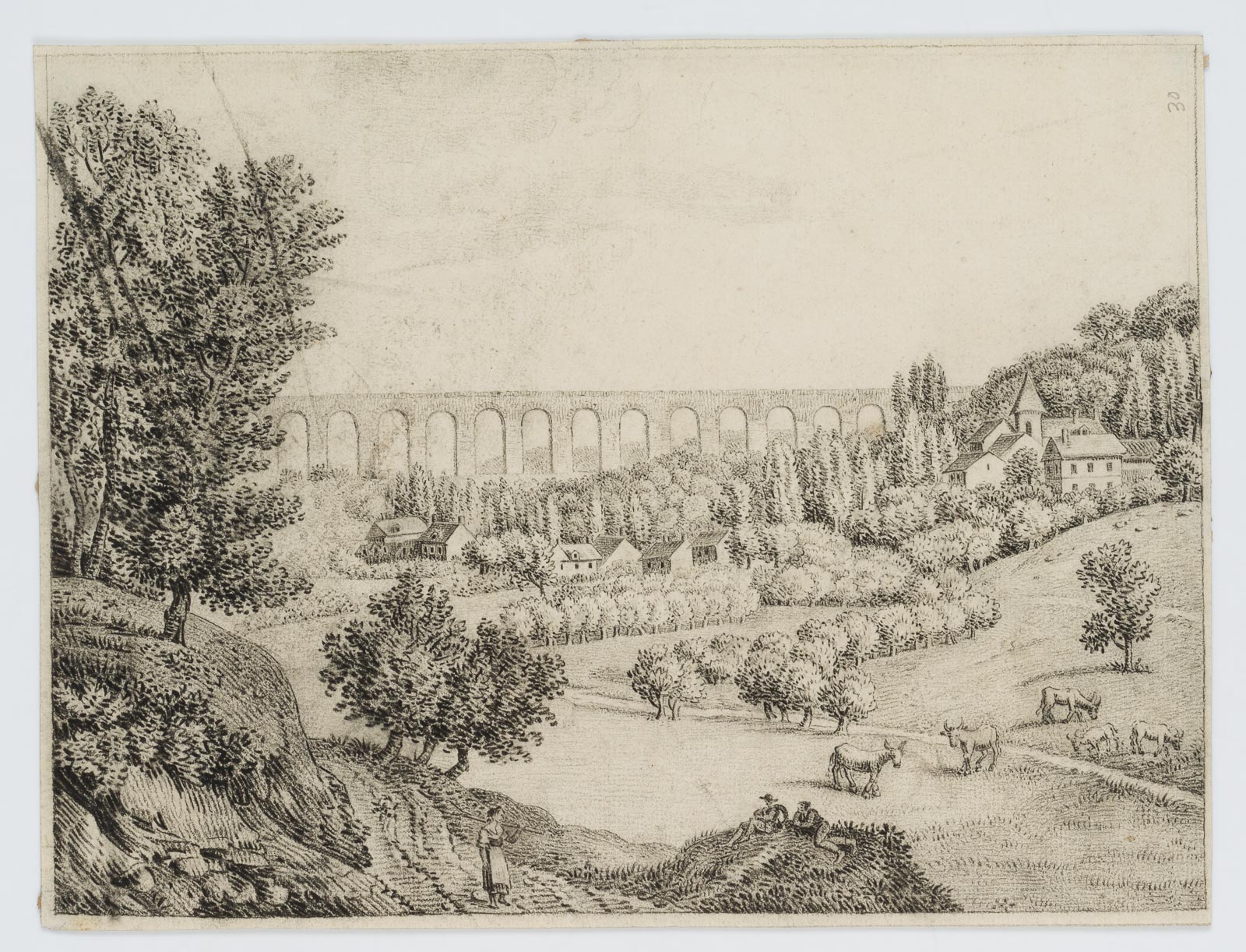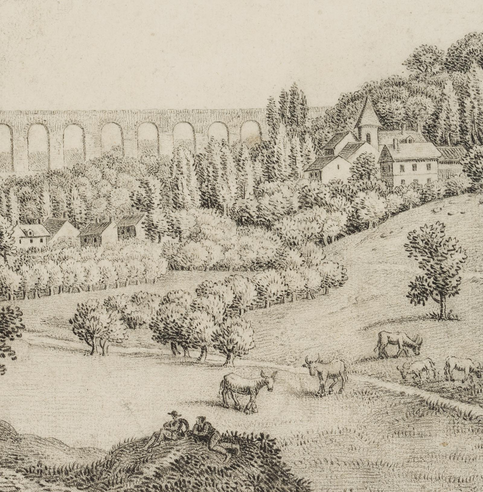 Charles de Graimberg (1774 Paars – 1865 Heidelberg), Landschaft mit Aquädukt, Dorf und Bauern, um 1800, Kohle
