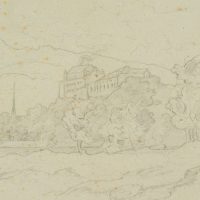 - Beschreibung: Blick in eine weite Landschaft mit zahlreichen Bäumen und Sträuchern im Mittelgrund. Dahinter, auf einem Hügel gelegen, erhebt sich eine Burganlage oder Residenz, aus deren Schornstein Rauch aufzusteigen scheint. Im Hintergrund die Spitze eines Kirchturms und die Silhouette eines massiven Berghangs.
