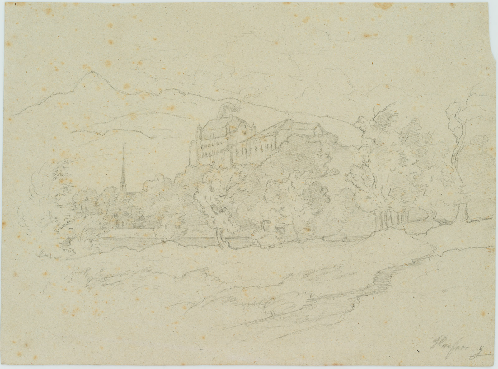 Carl Häfner (1814 Lübeck – 1873 München), Blick i.e. Landschaft mit Burg, um 1840, Bleistift