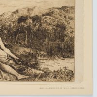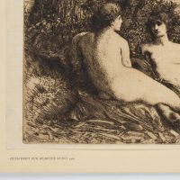 - Beschreibung: Die qualitätvolle Radierung zeigt zwei junge unbekleidetet Damen, die in an einem üppig begrünten Flussufer lagern