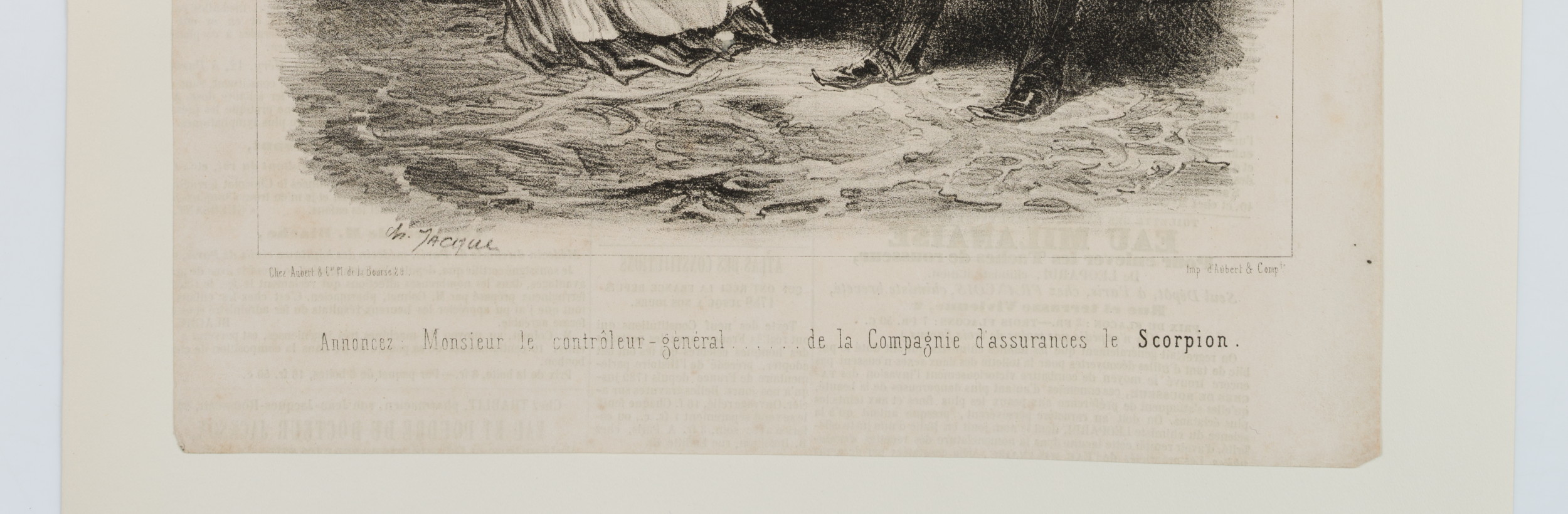 Bildunterschrift. Aus dem Französischen übersetzt: “Ansage: Herr Generalkontrolleur … der Versicherungsgesellschaft Skorpion” - Verso: Typographischer Druck, Werbeanzeigen