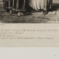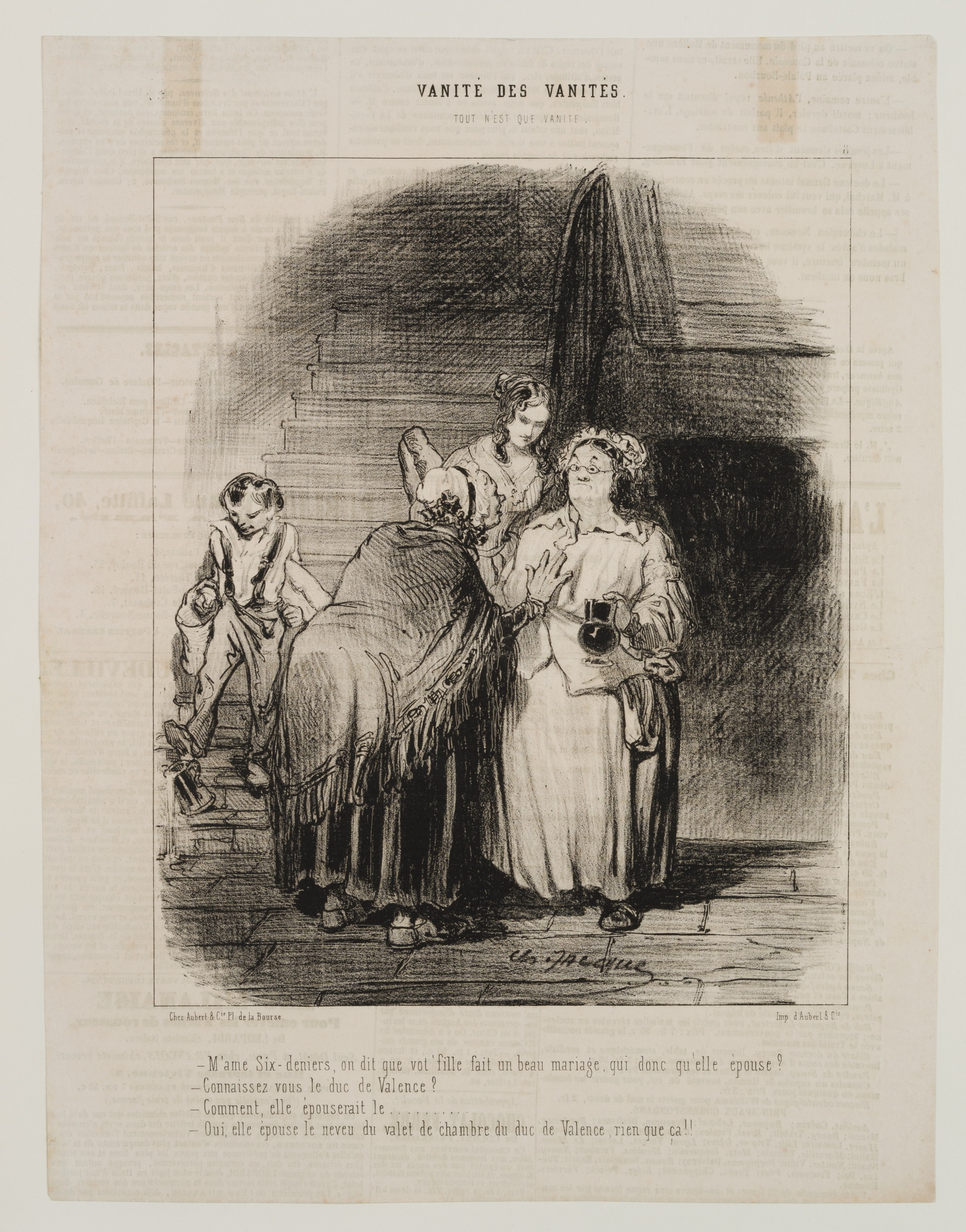 Caption. Translated from the French: “- Madame, 6 Deniers, I was wondering if I feel able to do what I have to do? – Do you know the Duke of Valencia? – How, she would marry the…. marry? – She is marrying the nephew of the Duke of Valencia’s scribe!!! - Verso: Typographic printing, advertisements
