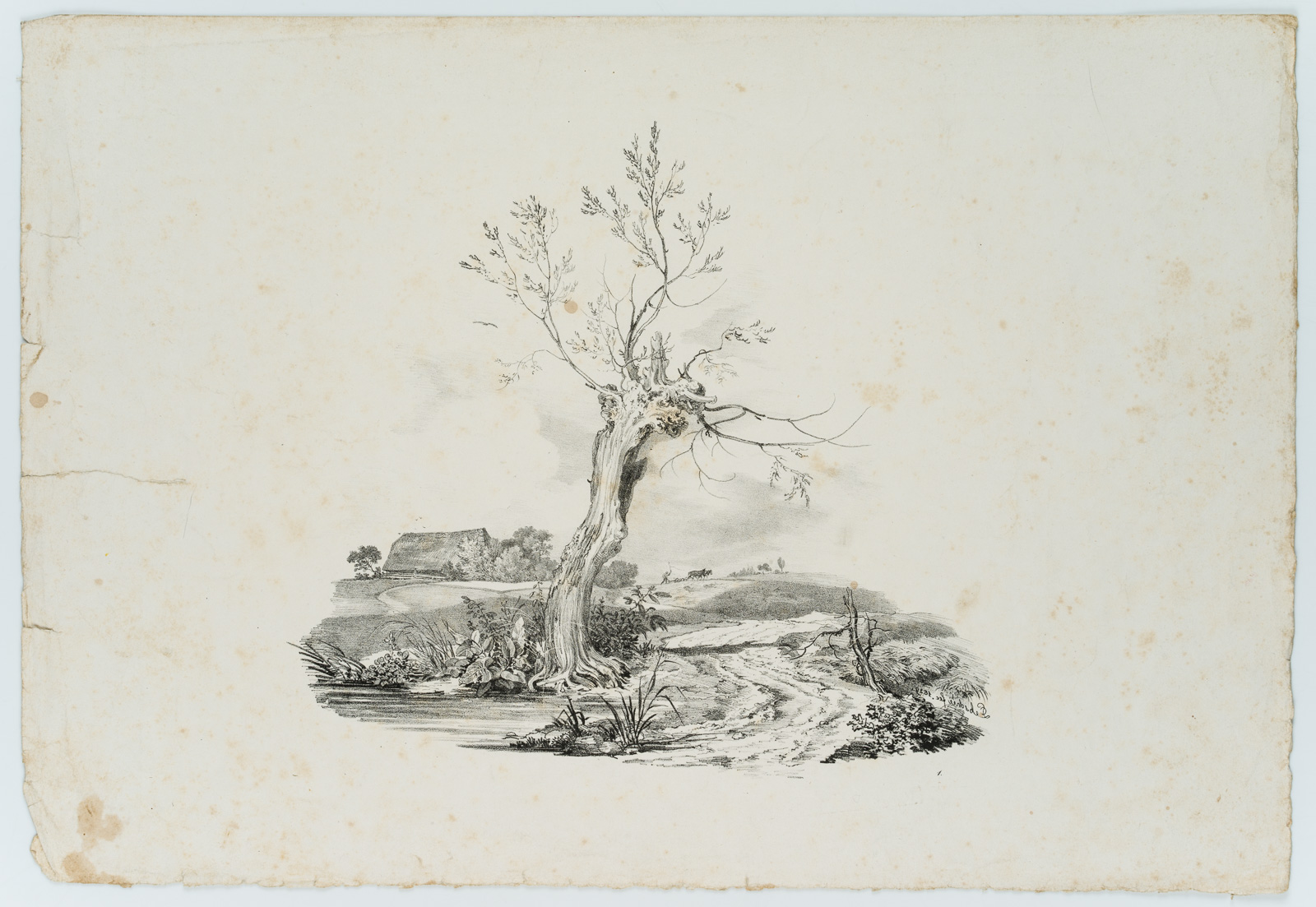 - Inscription: Inscribed in reverse on the lower right “Lithographie von C. Lebschée bei Hermann, München, 1829”. View of a thatched farmhouse, in front a body of water with lush foliage. The charm of the sheet arises from the tension between the perspective on the lovingly treated details in close proximity on the one hand and the painterly overall view of the landscape on the other.